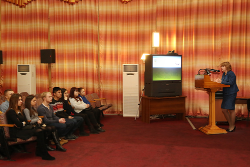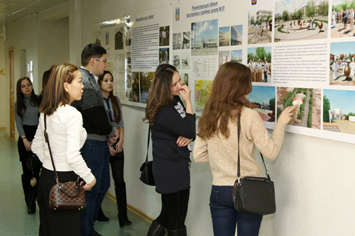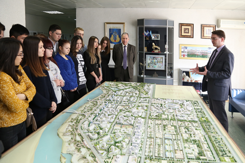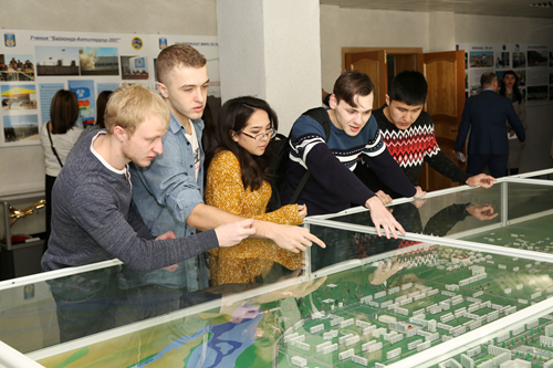 Затем студенты переместились в холл, где начальник отдела архитектуры и градостроительства – главный архитектор города Илья Ершов представил перспективный план развития города Байконура. Свой рассказ он продолжил в большом зале, где провел презентацию проекта благоустройства зоны отдыха и жилых кварталов, реконструкции пешеходной зоны проспекта Королева и центральной площади.