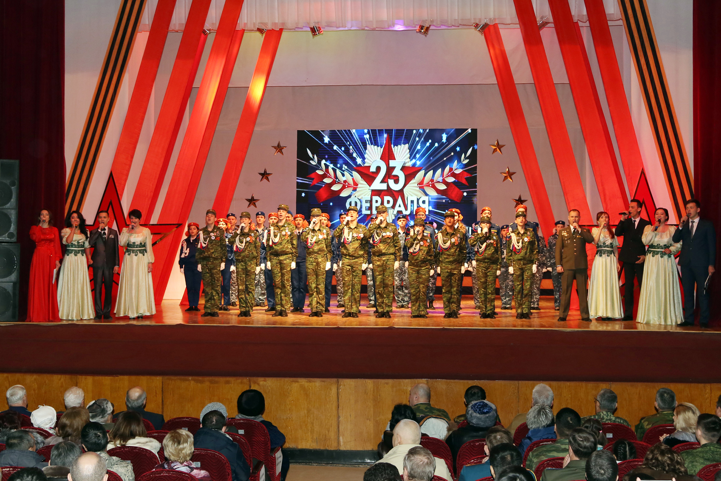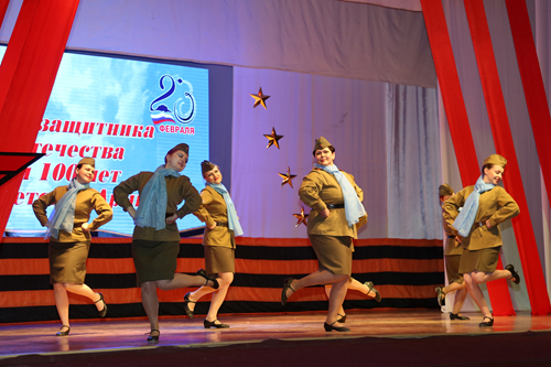 В концертной программе прозвучали песни, посвященные мужчинам и армейской службе, в исполнении солистов и духового оркестра ГДК. Тарас Ворона спел «Марш Космических войск» собственного сочинения. Шквал аплодисментов вызвала песня «Я служу России», которую исполнили Артур Придворов, Мейрамбек Ельдизеров и Эльзар Абдрахманов, прошедшие срочную службу в Вооруженных силах Российской Федерации. С задорным номером «Военное попурри» выступил ансамбль народно-сценического танца «Русские самоцветы».