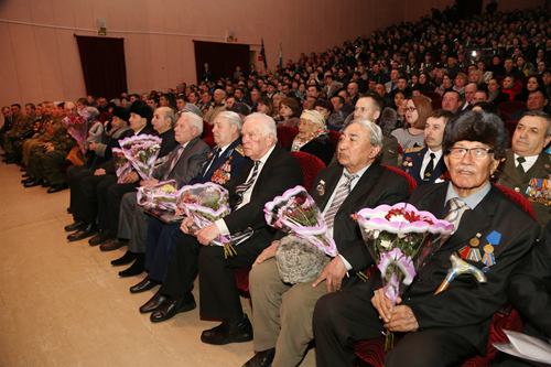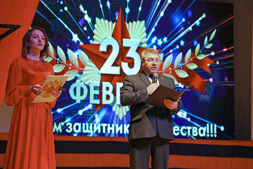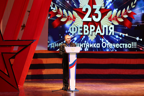 В начале торжественного собрания, проходившего в большом зале ГДК, заместитель главы администрации Николай Адасёв поздравил горожан с праздником, особо выделив почетных гостей – ветеранов войны и космодрома Байконур. В своей речи он отметил: «Сменяются эпохи и поколения, но честь, долг, верность присяге, готовность отдать жизнь за Родину не разделимы с высоким званием - защитник Отечества». Заместитель главы подчеркнул неоценимый вклад воинов всех поколений в дело сохранения целостности и мощи государства, мирной жизни страны. Николай Адасёв выделил особую роль военных строителей, которые, преодолевая огромнейшие трудности, в рекордные сроки возвели первый в мире космодром.