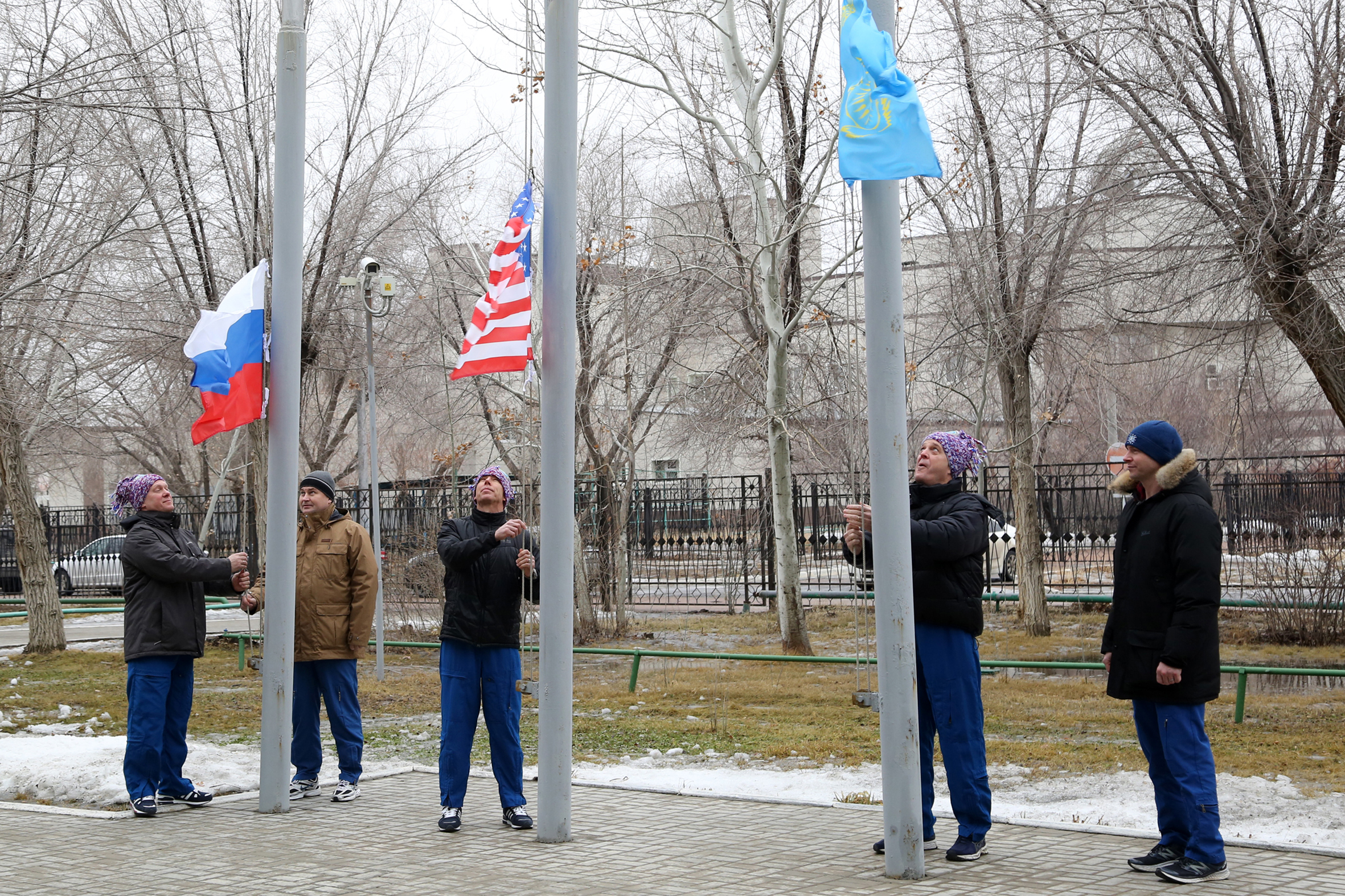 6 марта на Байконуре в испытательном учебно-тренировочном комплексе НИИ ЦПК им. Ю.А. Гагарина состоялась церемония поднятия флагов стран, участвующих в запуске транспортного пилотируемого корабля (ТПК) «Союз МС-08» и длительной экспедиции на МКС.