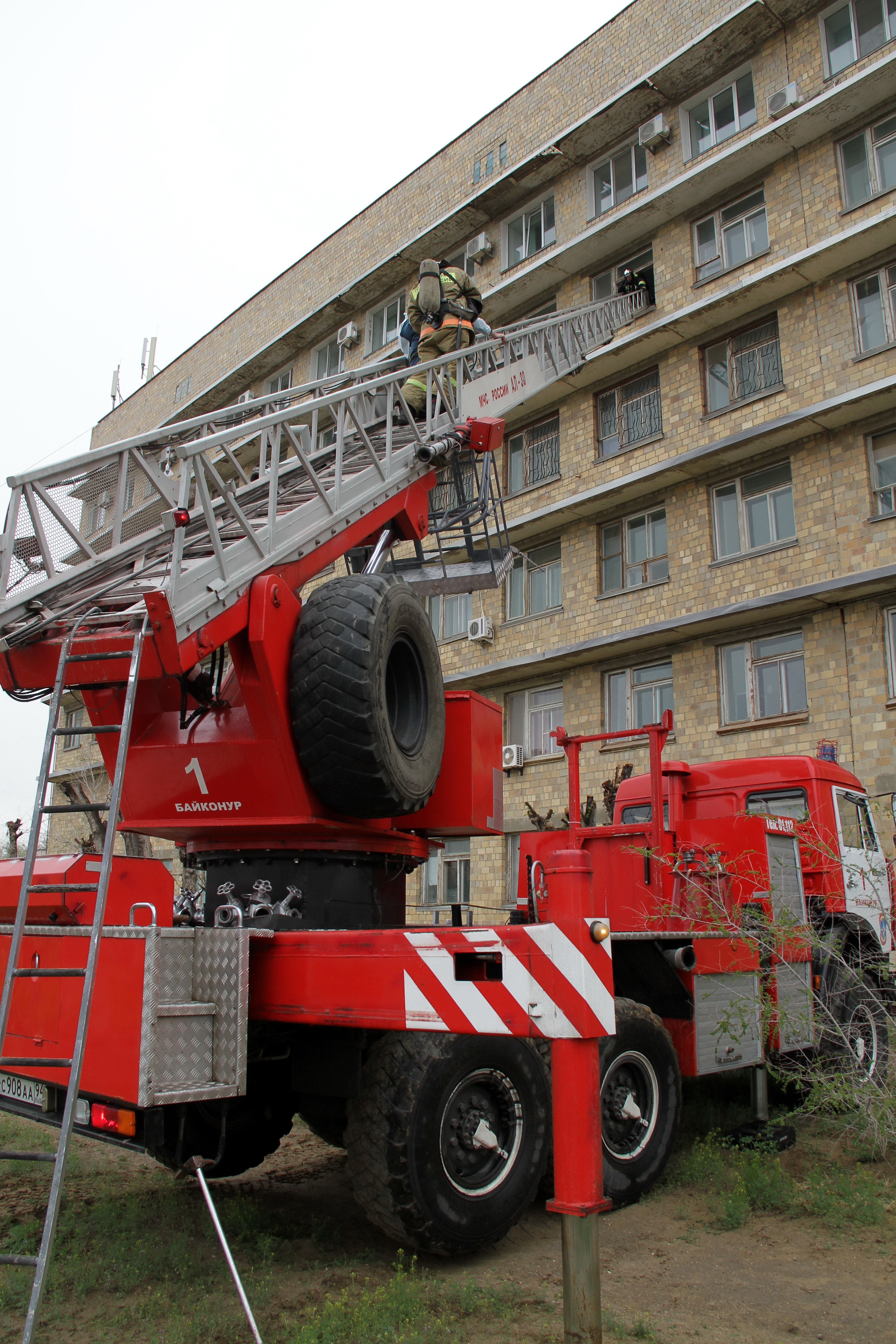 Используя аппараты защиты органов дыхания пожарные провели разведку помещений и приступили к спасению людей, которые, по замыслу учений, не смогли сами выйти наружу. Одного "пострадавшего" сняли с пятого этажа при помощи автолестницы - он оказался "отрезан огнём от путей эвакуации", второго "надышавшегося дымом" эвакуировали на носилках, предварительно надев на него спасательное устройство.