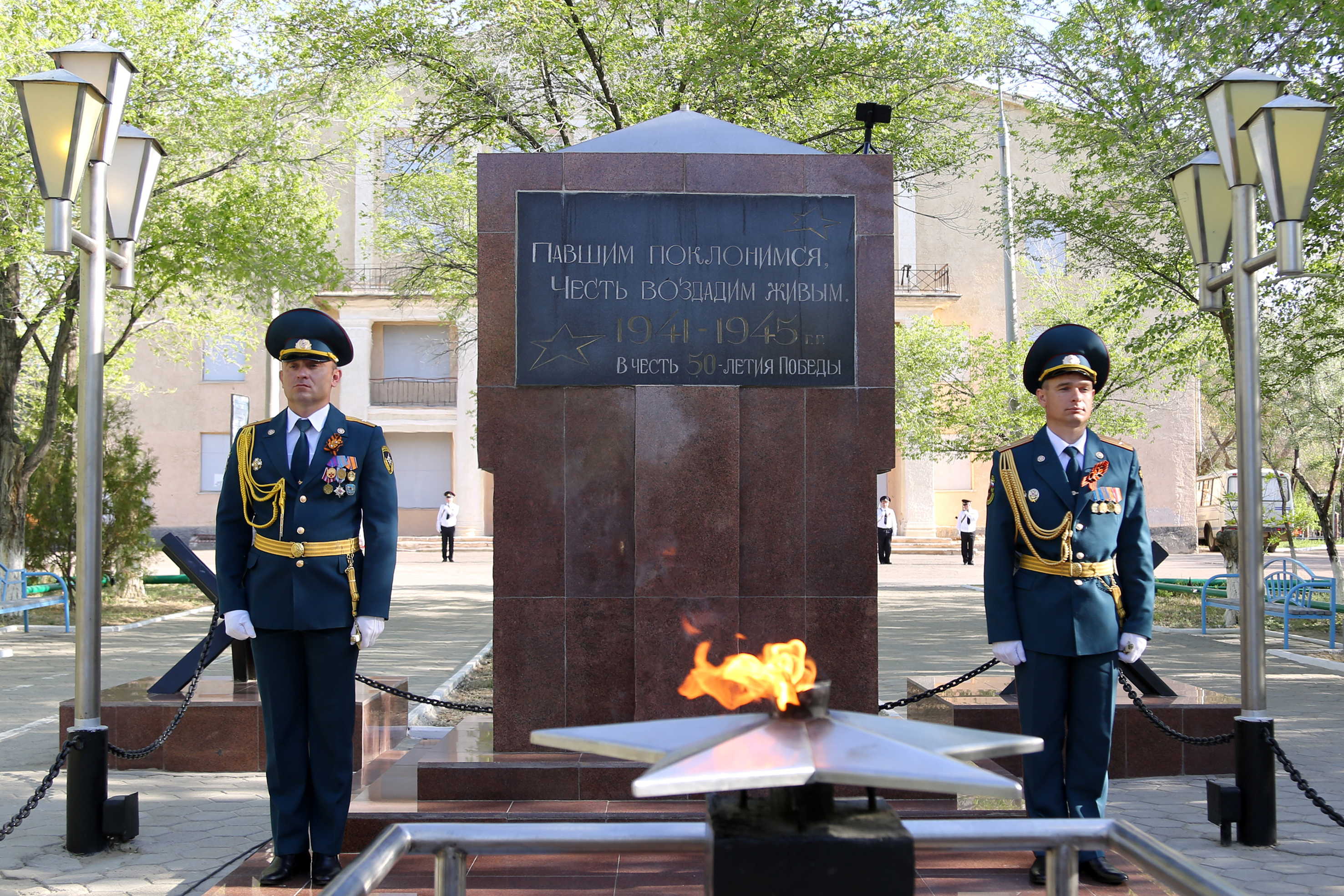 После оружейных залпов, прогремевших в память о жертвах войны, сотрудники Спецуправления ФПС №70 МЧС России, байконурского представительства МВД Республики Казахстан, Управления МВД России на комплексе «Байконур» прошли торжественным маршем.