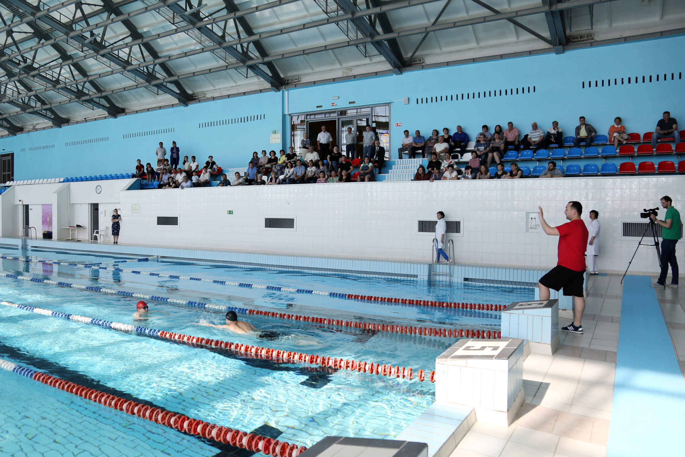 После «спасения» условный пострадавший был транспортирован на «берег», где медицинские работники бассейна продемонстрировали приемы оказания первой медицинской помощи: перевернули пострадавшего лицом вниз, «удалили воду» из дыхательных путей, положили его на спину и провели искусственное дыхание. Олжас Жундубаев подчеркнул, что при остановке сердечной деятельности необходимо также произвести непрямой массаж сердца.