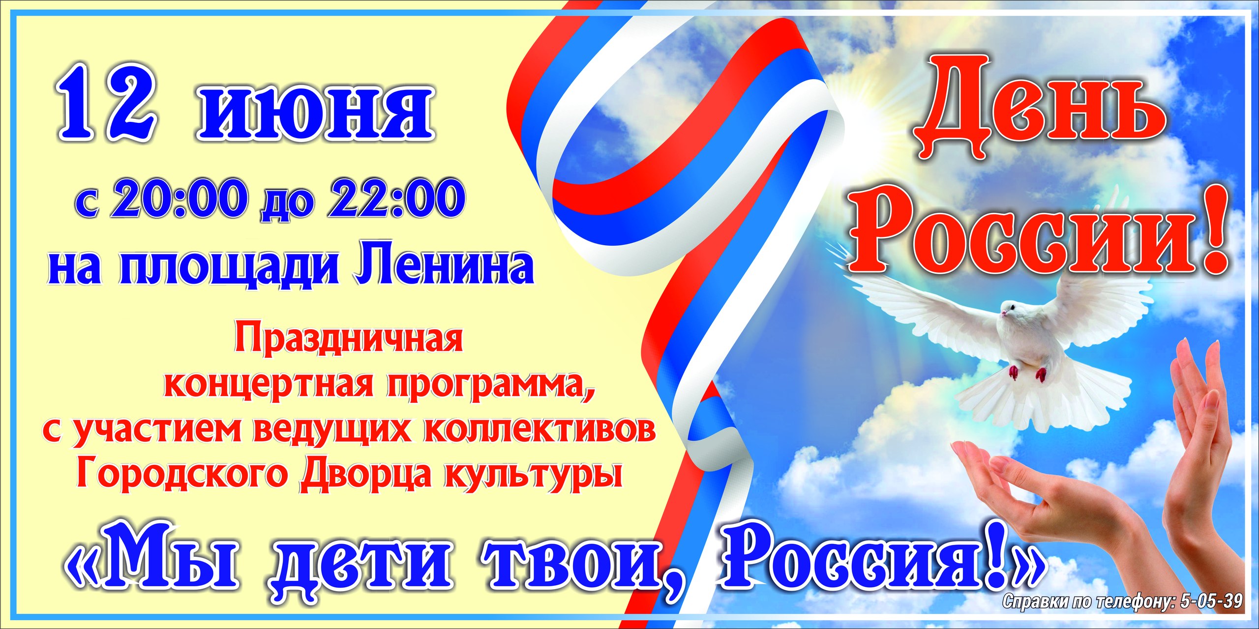 12 июня. 20:00 – 22:00. Площадь Ленина. Праздничная концертная программа «Мы дети твои, Россия!» с участием творческих коллективов Городского дворца культуры