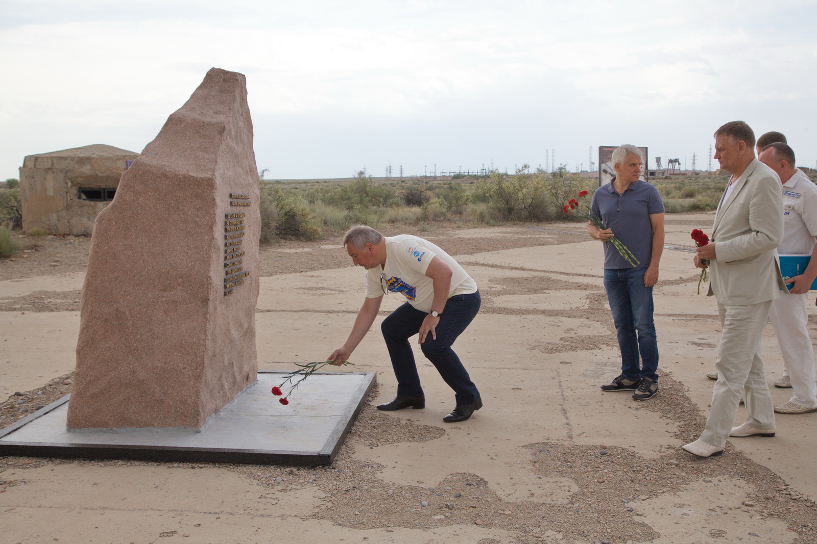 По сообщению РОСКОСМОСА, генеральный директор РОСКОСМОСА Дмитрий Рогозин посетил Мемориал погибшим испытателям космодрома Байконур на площадке 41 и возложил цветы к обелиску.