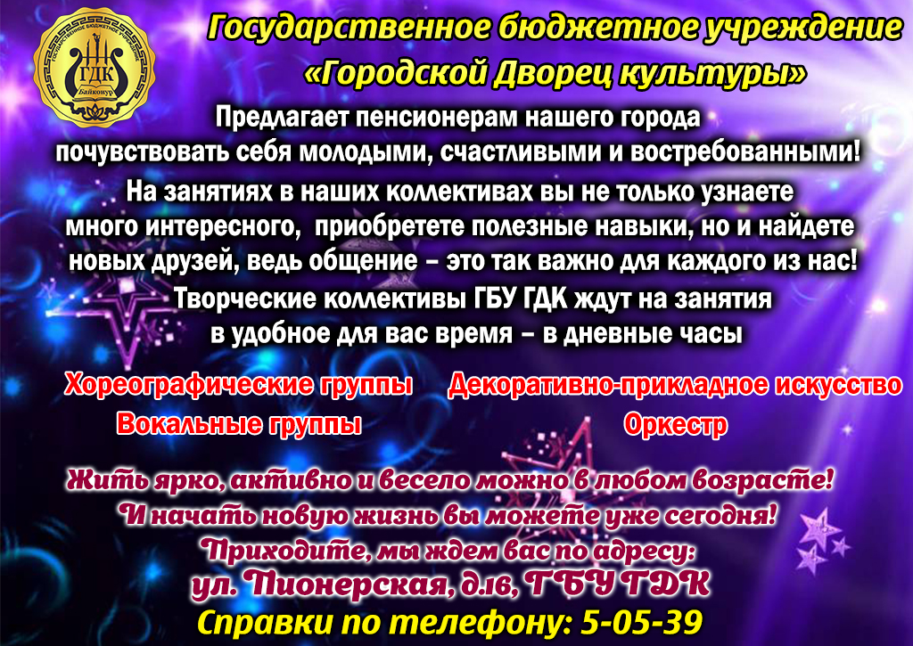 14.09.2018 - 07.11.2018  Городской Дворец культуры приглашает пенсионеров на занятия