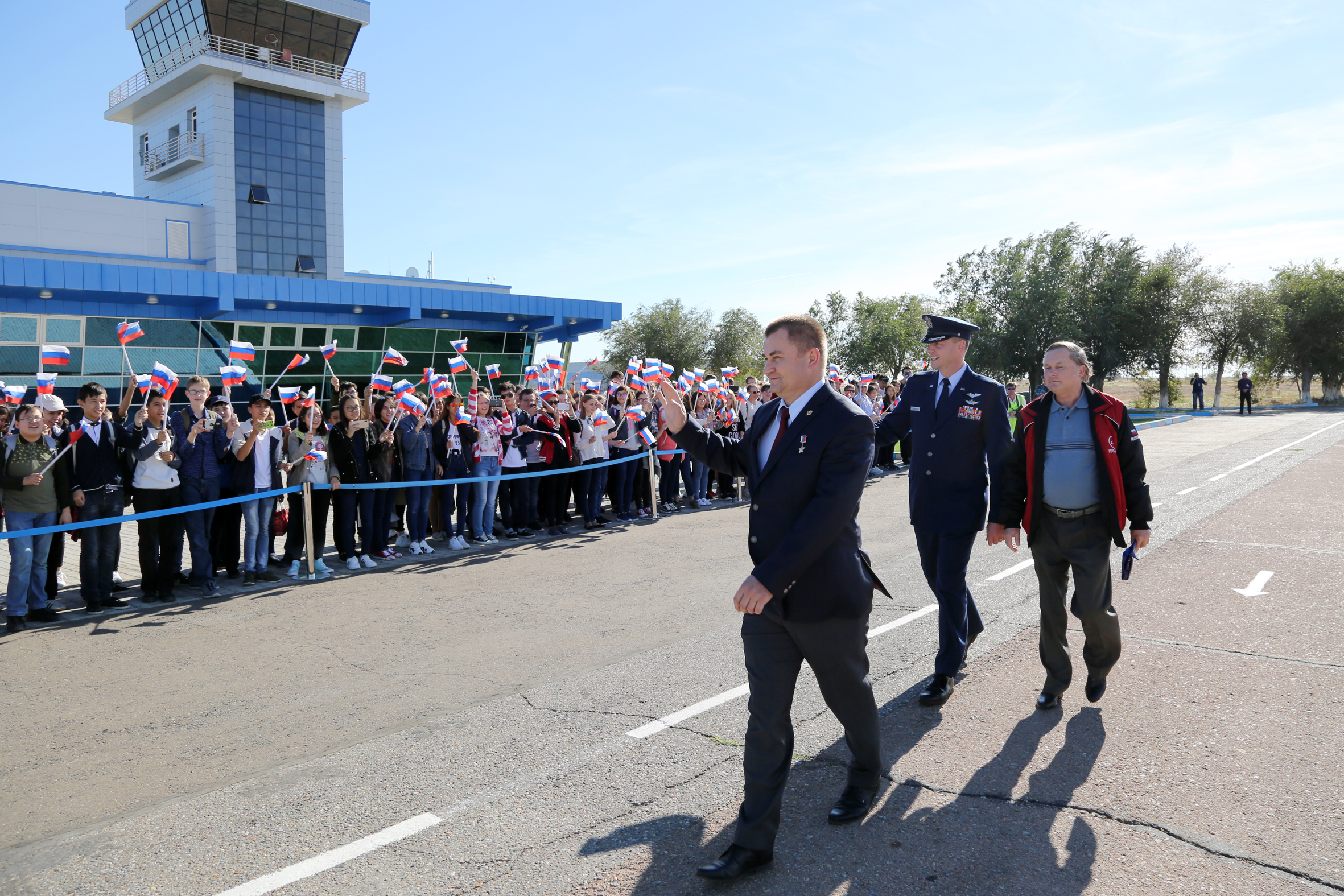 В аэропорту «Крайний» их встретили члены Технического руководства и Государственной комиссии. Также приветствовали экипажи МКС-57/58 учащиеся Международной космической школы.