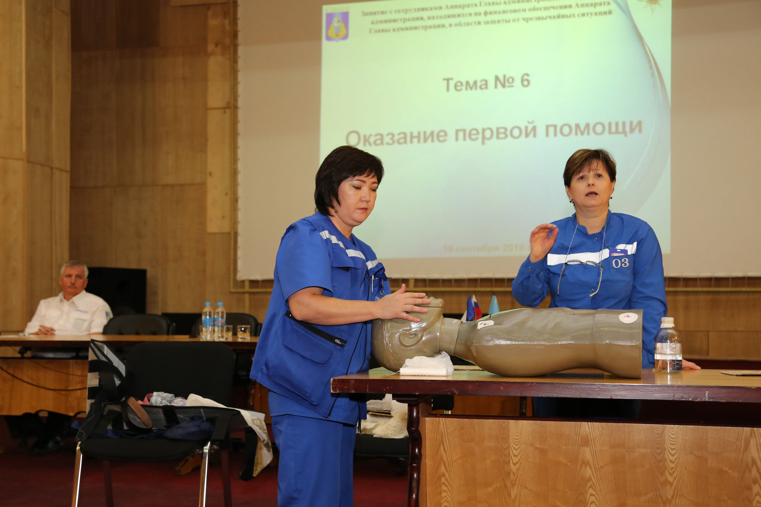 Занятия проводили сотрудники ЦМСЧ № 1 ФМБА России, обладающие объемными теоретическими знаниями и богатым практическим опытом. Наталья Рюмшина рассказала о типичных травмах, видах и признаках переломов, кровотечений и ожогов, способах и методах первой помощи. Практические действия по оказанию помощи пострадавшему продемонстрировала Багдагуль Калиева. Абжаппаров Бауржан и Алжанов Даулет рассказали о реанимационных действиях, методах проведения искусственного дыхания и непрямого массажа сердца и продемонстрировали их.