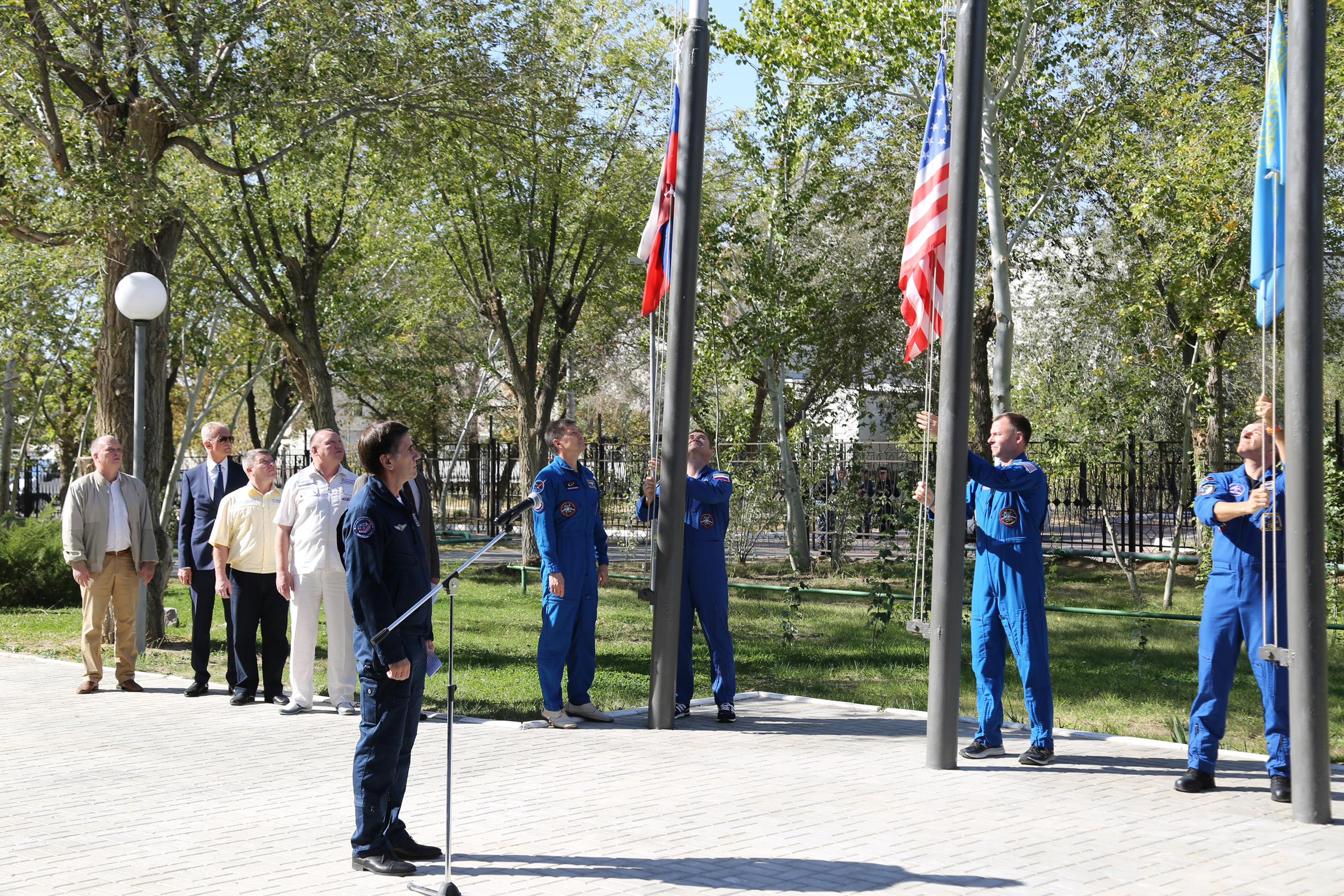 27 сентября на Байконуре в испытательном учебно-тренировочном комплексе НИИ ЦПК им. Ю.А. Гагарина состоялась церемония поднятия флагов стран, участвующих в запуске транспортного пилотируемого корабля (ТПК) «Союз МС-10» и длительной экспедиции на МКС.
