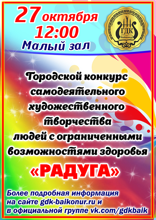 27 октября (суббота). 12:00. ГДК (малый зал). Городской конкурс самодеятельного художественного творчества «Радуга» для людей с ограниченными возможностями здоровья