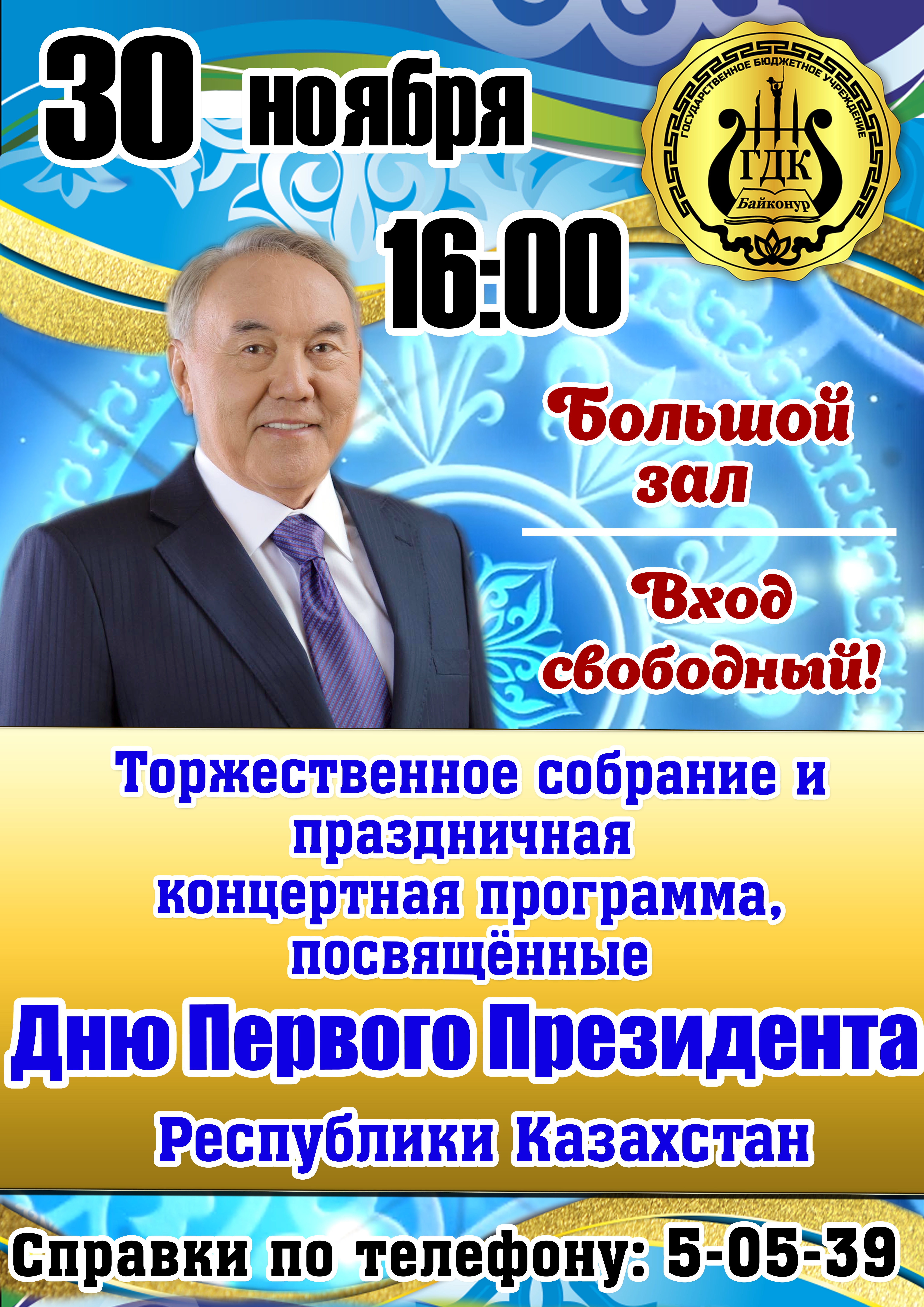 30 ноября. 16:00. ГДК (большой зал). Торжественное собрание и праздничная концертная программа, посвященные Дню Первого Президента Республики Казахстан