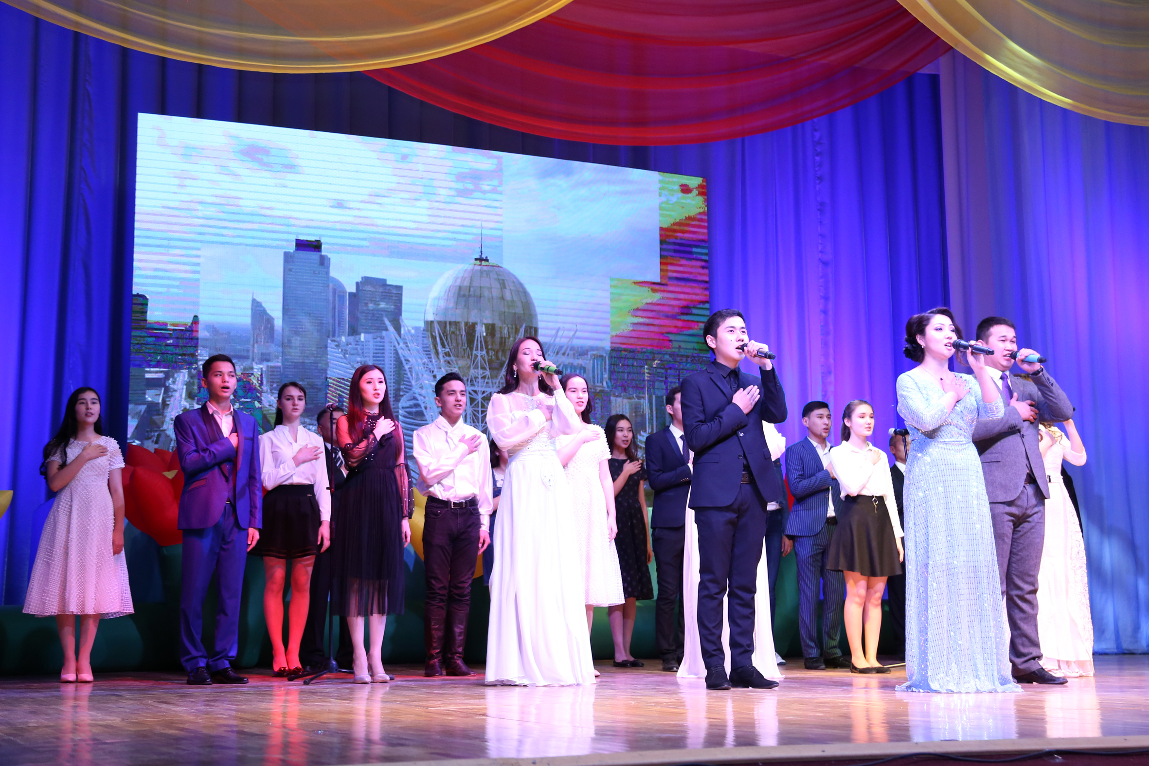 В начале торжественного собрания солисты ГДК исполнили государственный гимн Республики Казахстан.