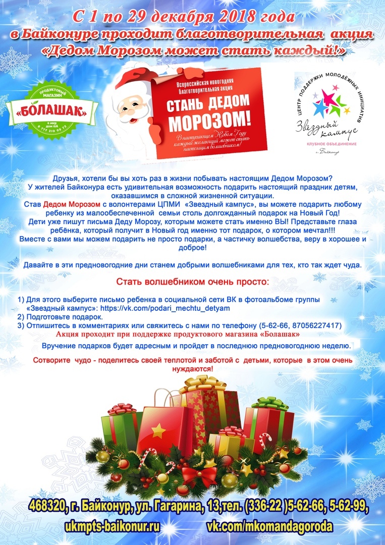 С 1 по 29 декабря Центр поддержки молодежных инициатив «Звездный кампус» при поддержке отдела молодежной политики Управления культуры, молодежной политики, туризма и спорта проводит в Байконуре благотворительную акцию «Дедом Морозом может стать каждый». В рамках акции жители города могут подарить детям с ограниченными возможностями здоровья и из малообеспеченных семей подарки на Новый год.