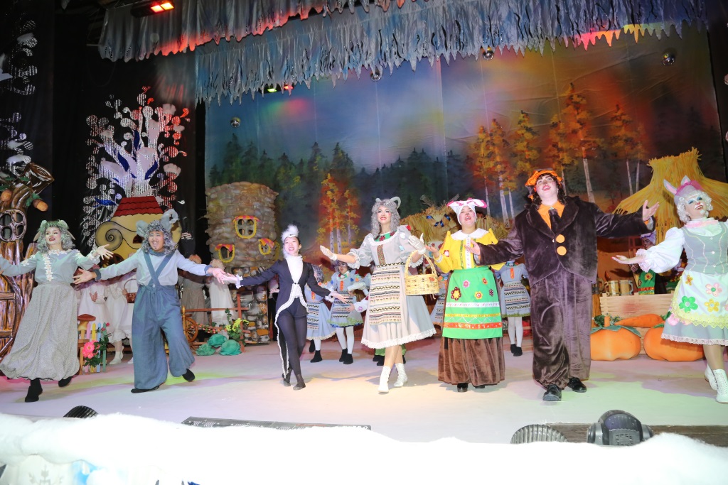На новогодних представлениях ребята встретились с героями мультфильма Дядюшкой Мокусом (Гульнур Сарсенова) и Фунтиком (Акгуль Шаламанова и Акмарал Кабулова), а также традиционными новогодними персонажами Дедом Морозом (Константин Французов) и Снегурочкой (Анна Лобовкина). На утренниках ребята играли в веселые игры, помогли маленькому доброму поросёнку и его друзьям превратить злую и жадную госпожу Белладонну (Оксана Ракович) в доброе создание.