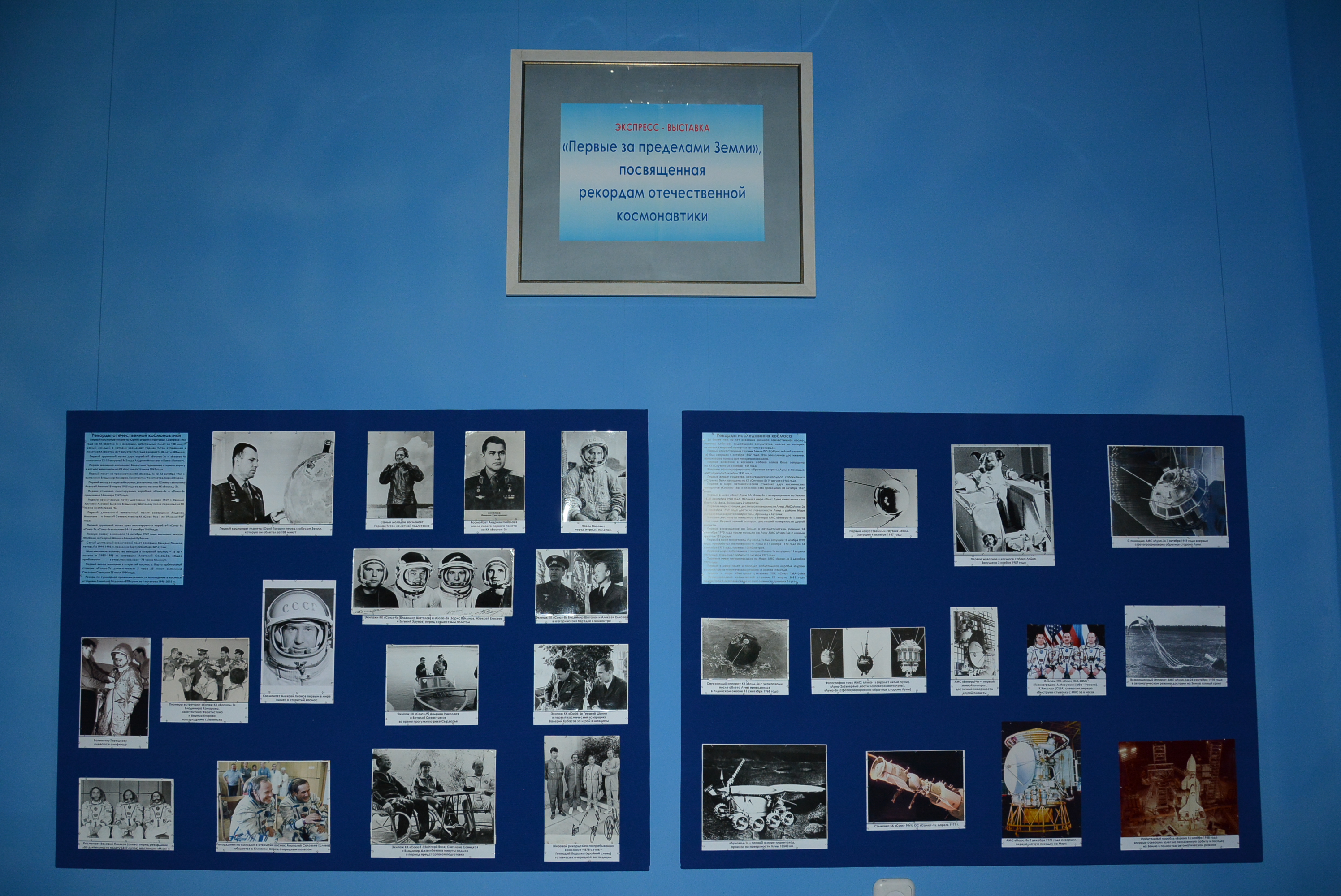 В числе событий, представленных в разделах выставки, рекорды отечественной космонавтики: полеты в космос первого космонавта планеты Юрия Гагарина и самого молодого в истории космонавтики космонавта Германа Титова, первый групповой полет двух кораблей «Восток-3» и «Восток-4», полет первой женщины-космонавта Валентины Терешковой на КК «Восток-6», первый полет на трехместном КК «Восход-1», первый выход в открытый космос длительностью 12 минут Алексея Леонова, первая стыковка пилотируемых кораблей «Союз-4» и «Союз-5», доставка первой космической почты, первый длительный автономный полет на КК «Союз-9», первый групповой полет трех пилотируемых кораблей «Союз-6», «Союз-7», «Союз-8», первая сварка в космосе, самый длительный космический полет (437 суток) на борту ОС «Мир», максимальное количество выходов в открытый космос (16 за 4 полета) космонавта Анатолия Соловьёва (общее пребывание в открытом космосе – 78 часов 48 минут), первый выход женщины-космонавта Светланы Савицкой в открытый космос, рекорд Геннадия Падалки по суммарной продолжительности нахождения в космосе (878 суток за 6 полетов).