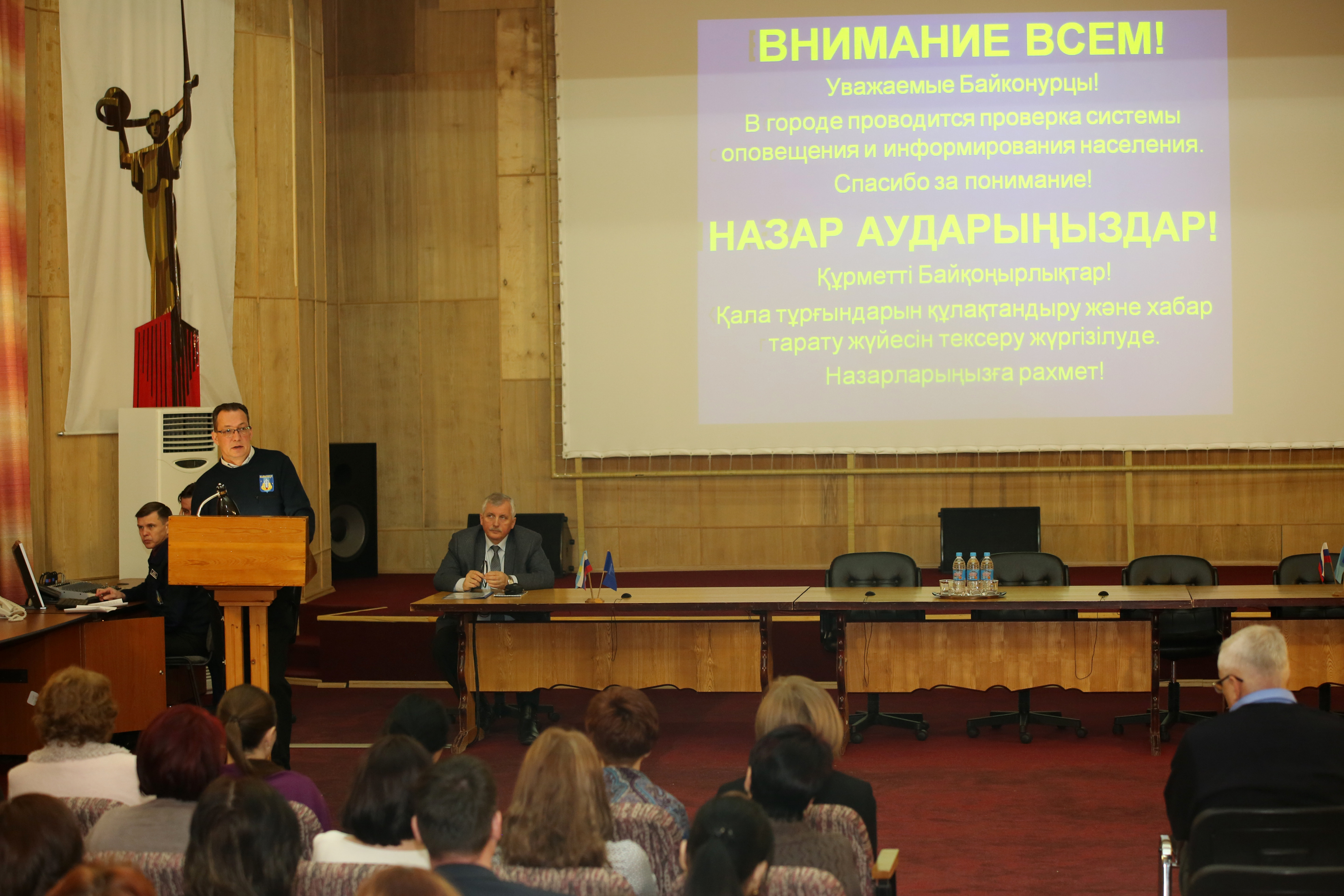 Руководитель занятий - заведующий сектором по чрезвычайным ситуациям отдела территориальной безопасности Управления Владислав Ильин рассказал о существующей системе оповещения населения города, порядке принятия решения должностными лицами о подаче сигнала «Внимание всем!» при возникновении или угрозе возникновения чрезвычайной ситуации природного и техногенного характера на территории комплекса «Байконур», а также действиях населения города по этому сигналу. В ходе занятий были продемонстрированы тематические видеоролики и презентация, в которых описывалась существующая система оповещения и порядок ее задействования при возникновении ЧС в Байконуре, а также были приведены примеры информирования и оповещения населения регионов России при угрозе или возникновении ЧС.