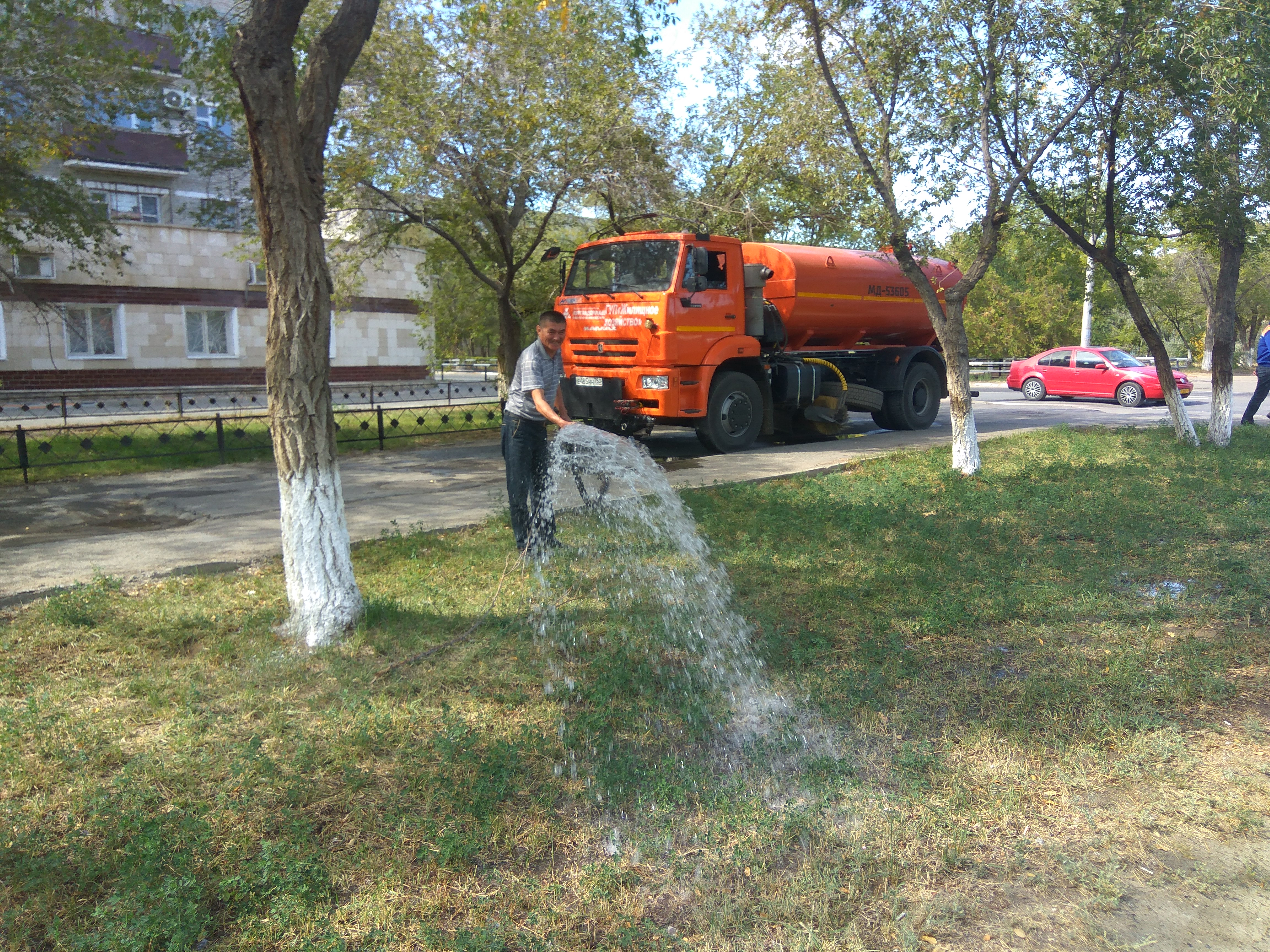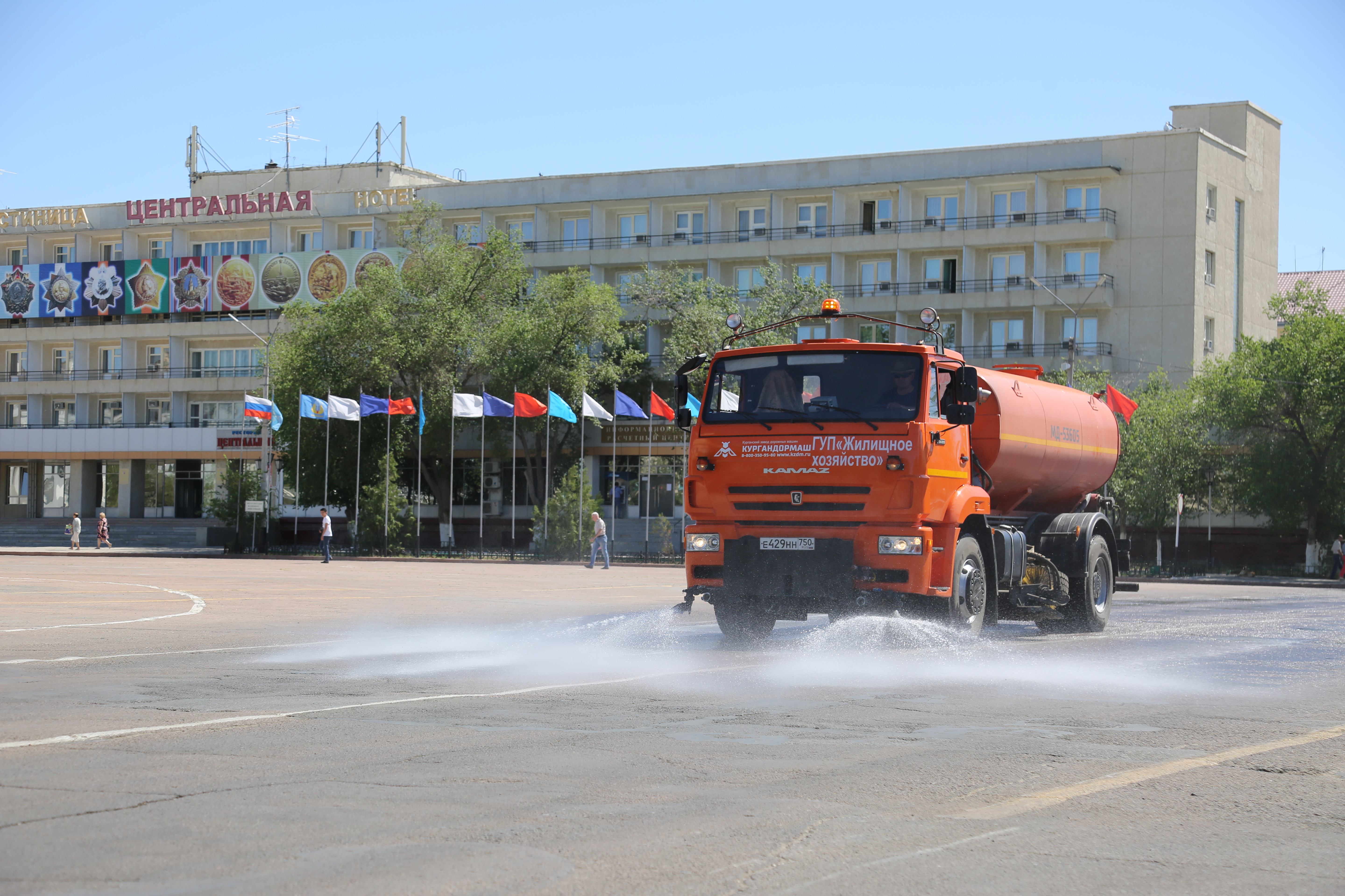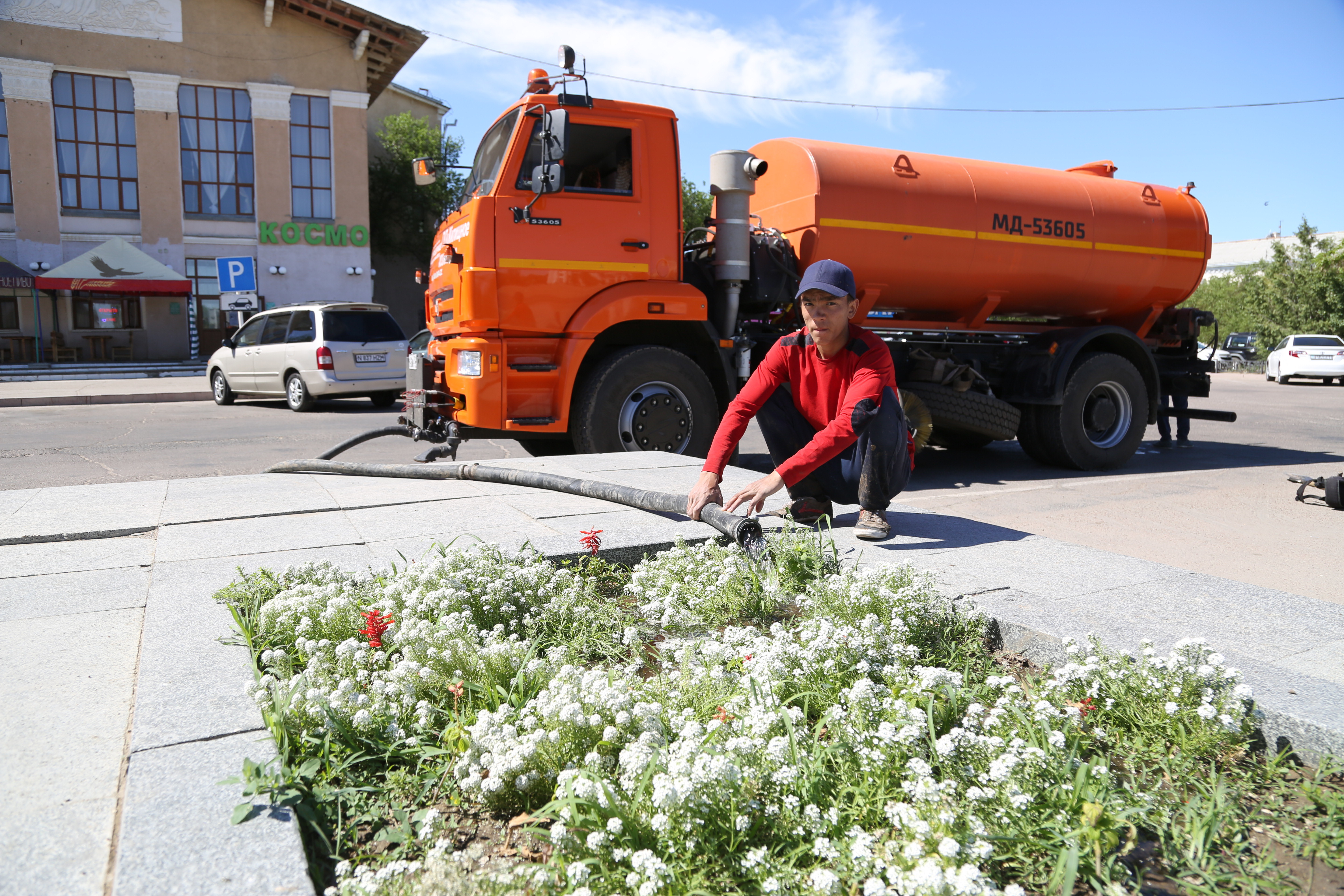 Кроме того, с помощью поливомоечных машин утром и вечером будет проводиться полив городских автодорог. Накануне майских праздников был проведен полив на центральных городских магистралях - проспектах Королев и Абая,