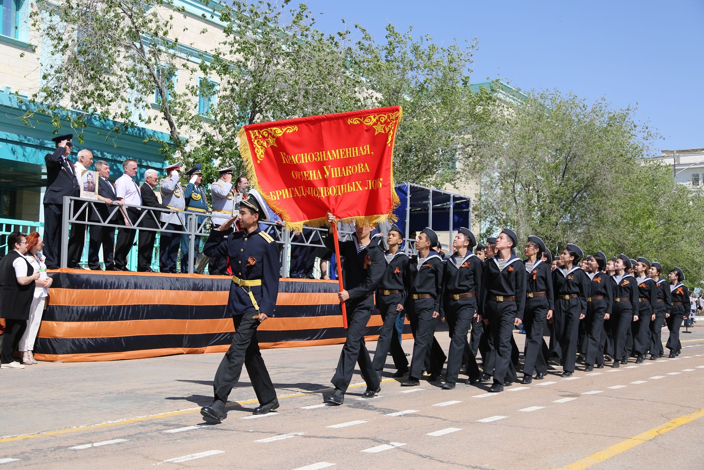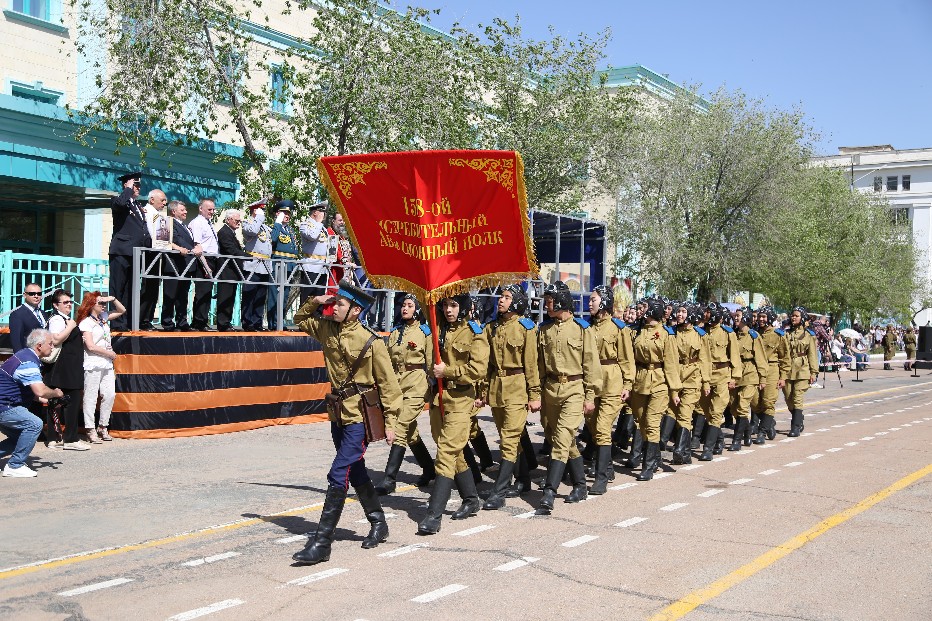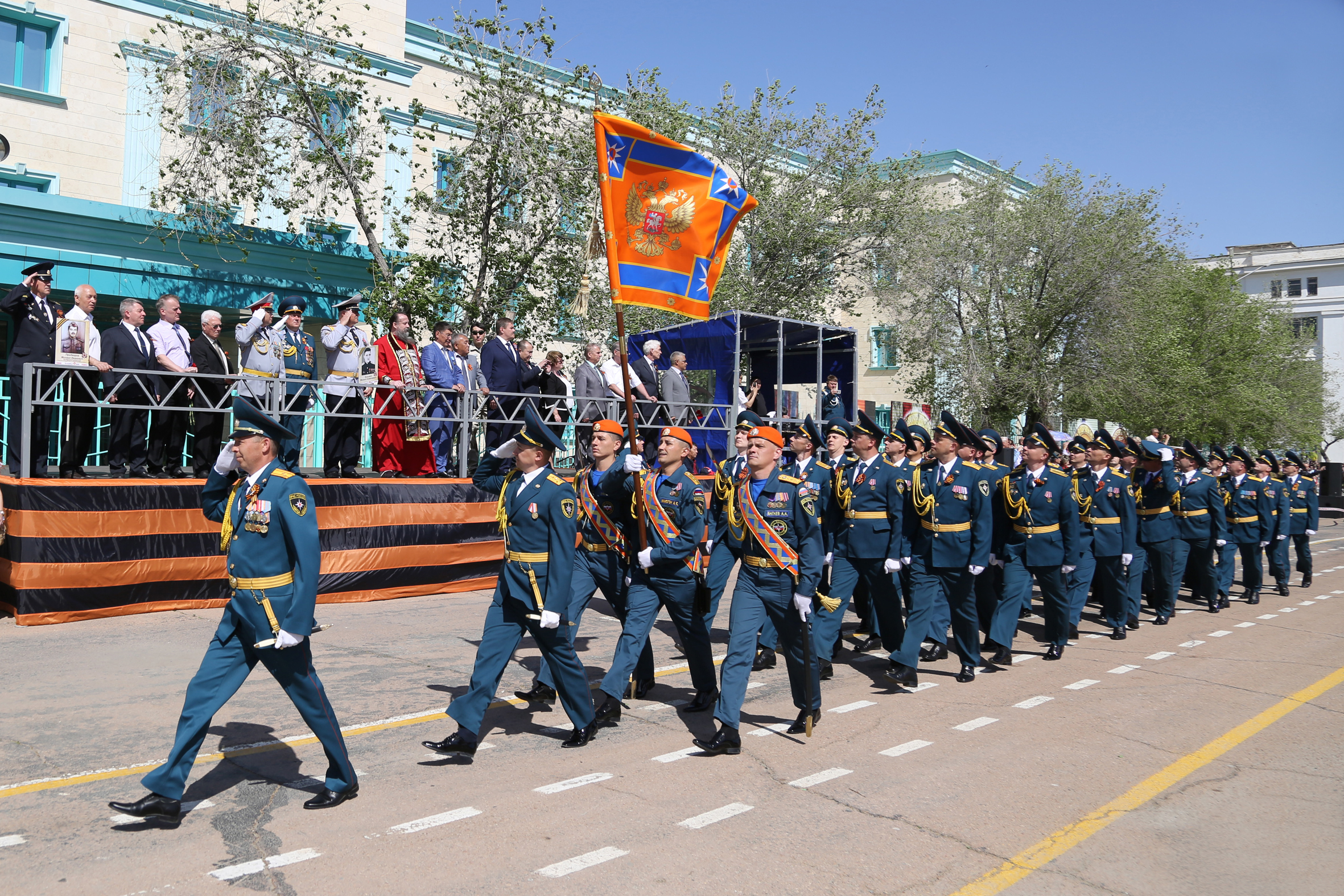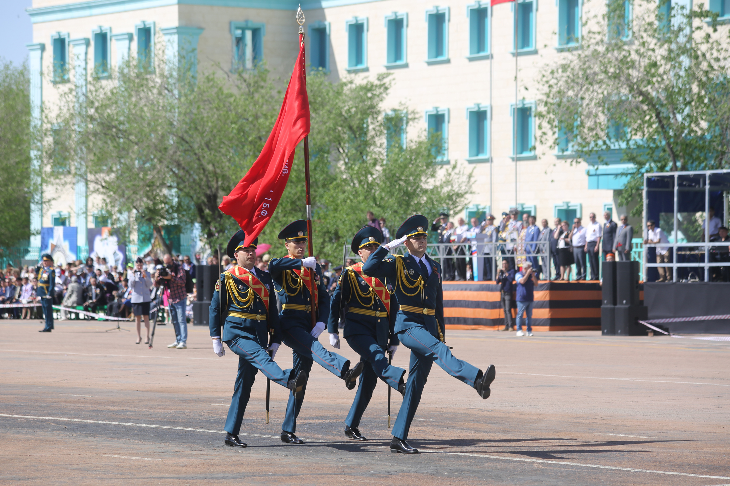 Затем началось торжественное прохождение строевых расчетов. Одна за другой колонны Спецуправления ФПС №70 МЧС России, УМВД России на комплексе "Байконур", Представительства МВД РК в городе Байконыр, а также учащиеся образовательных учреждений города, представляющие различные роды войск времен ВОВ, торжественным маршем прошли по центральной площади. С трибуны участников шествия приветствовали руководство города и космодрома Байконур, Управления по обеспечению деятельности специального представителя Президента Республики Казахстан на комплексе "Байконур", руководители правоохранительных органов, организаций и учреждений города и космодрома, представители духовенства, ветераны Великой Отечественной войны - труженики тыла.