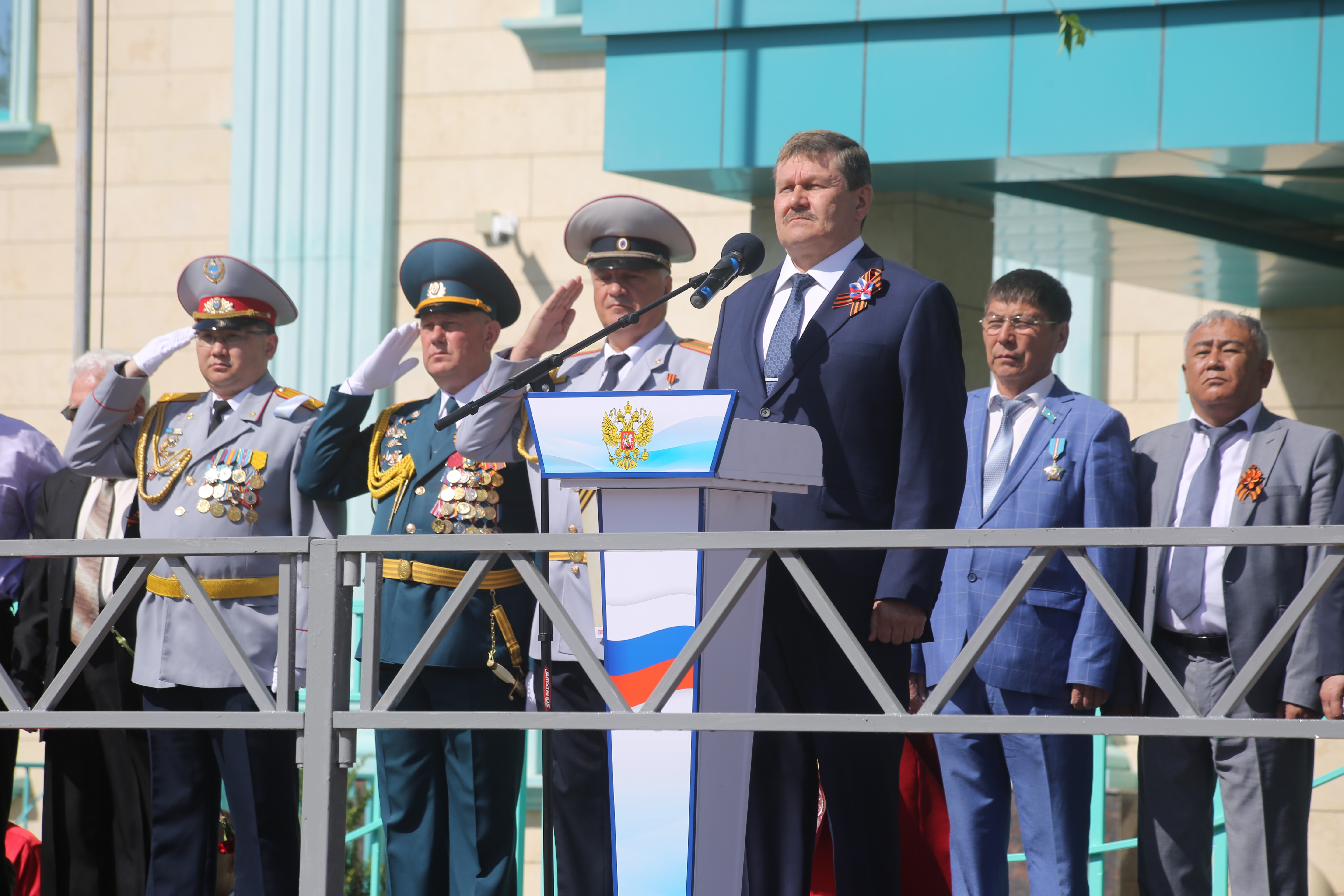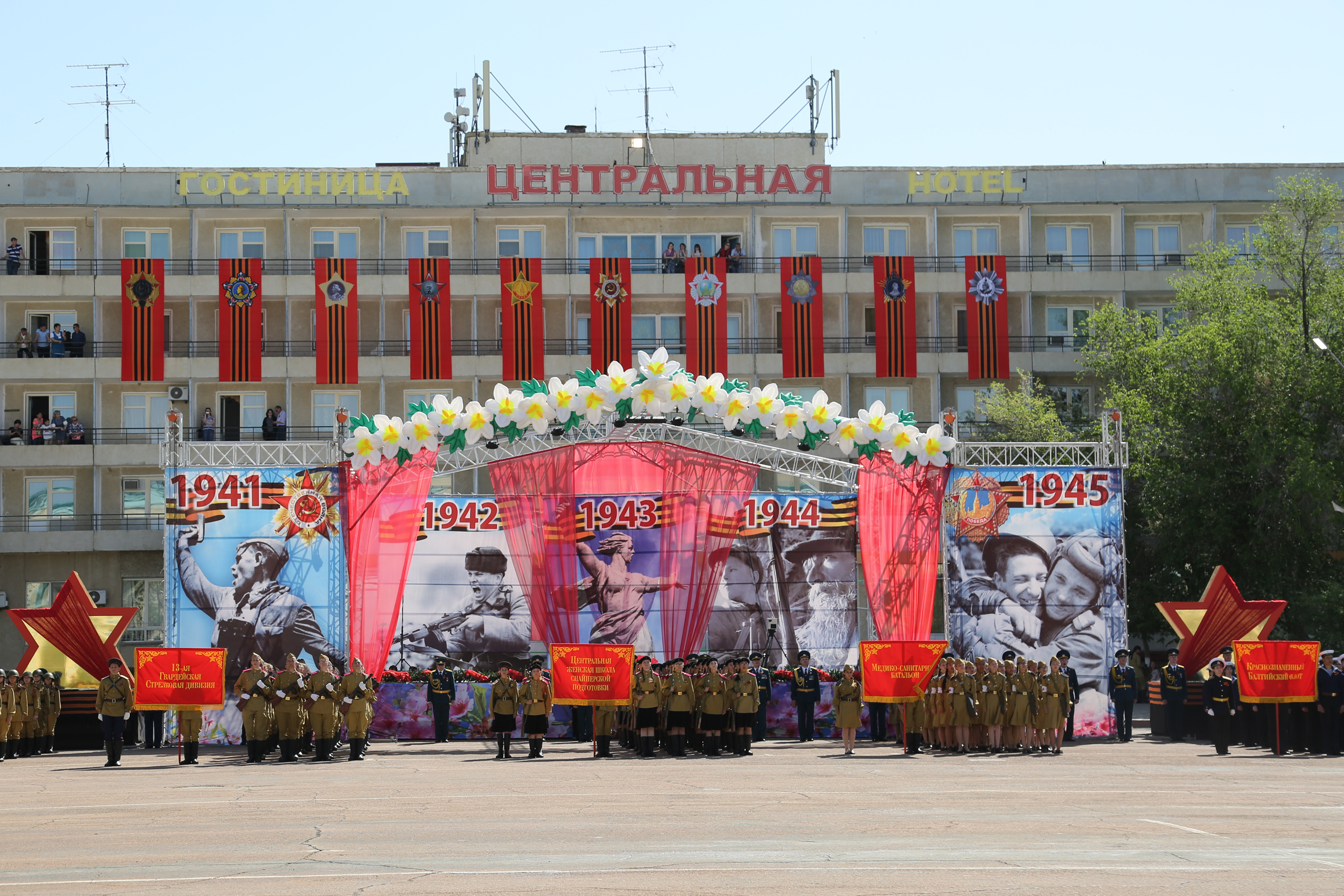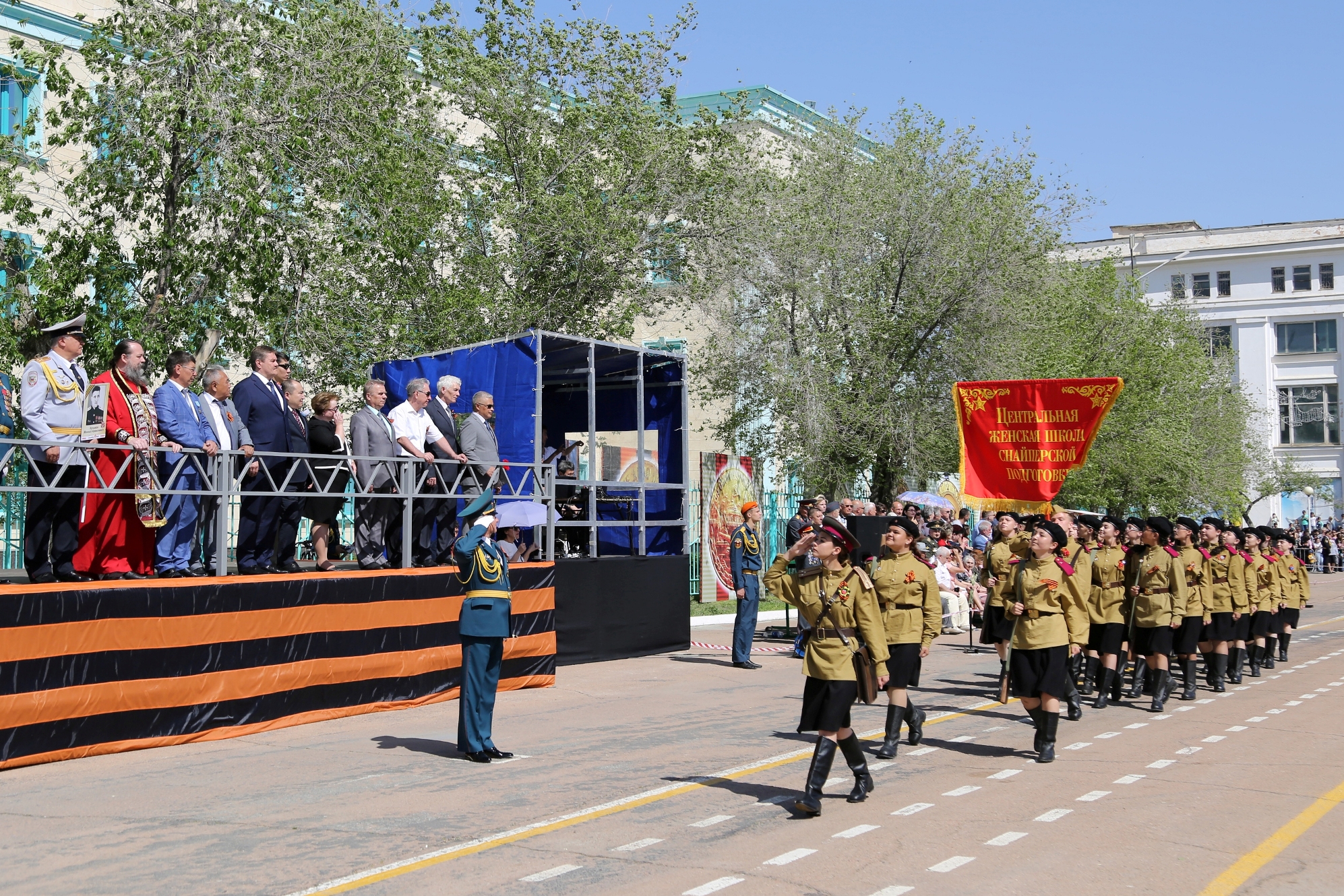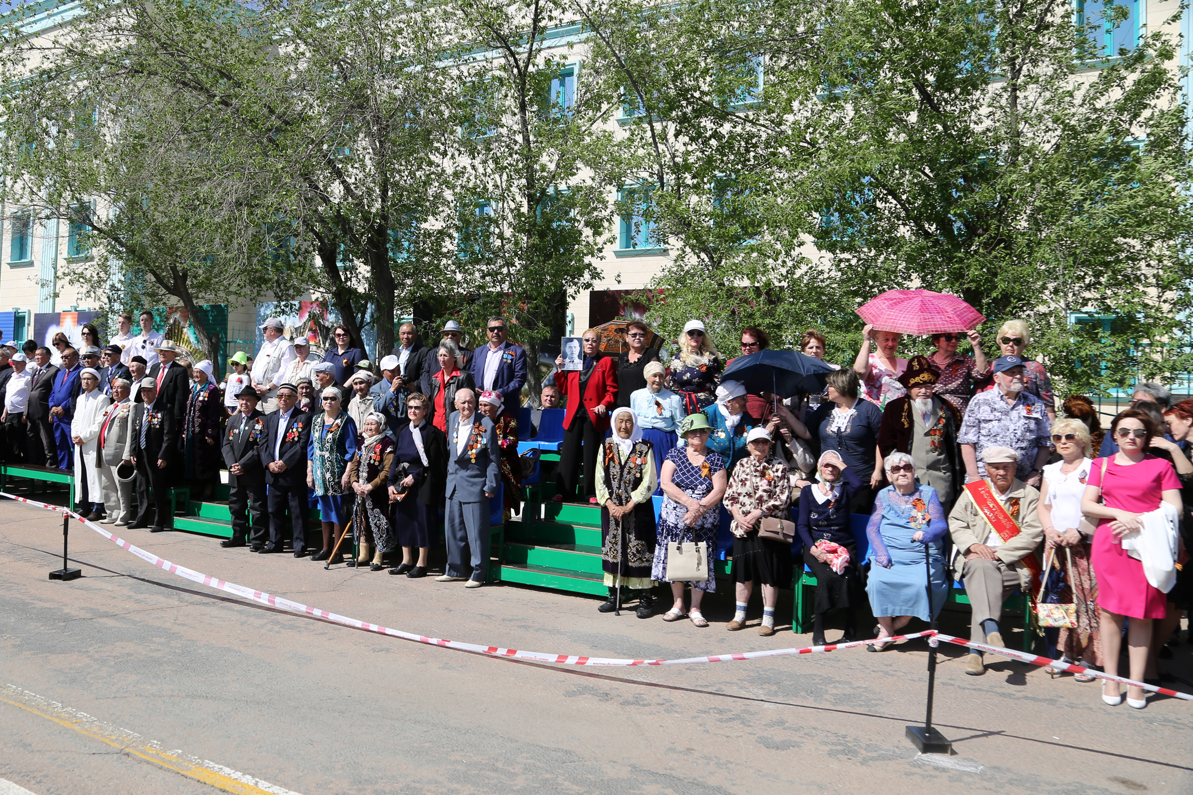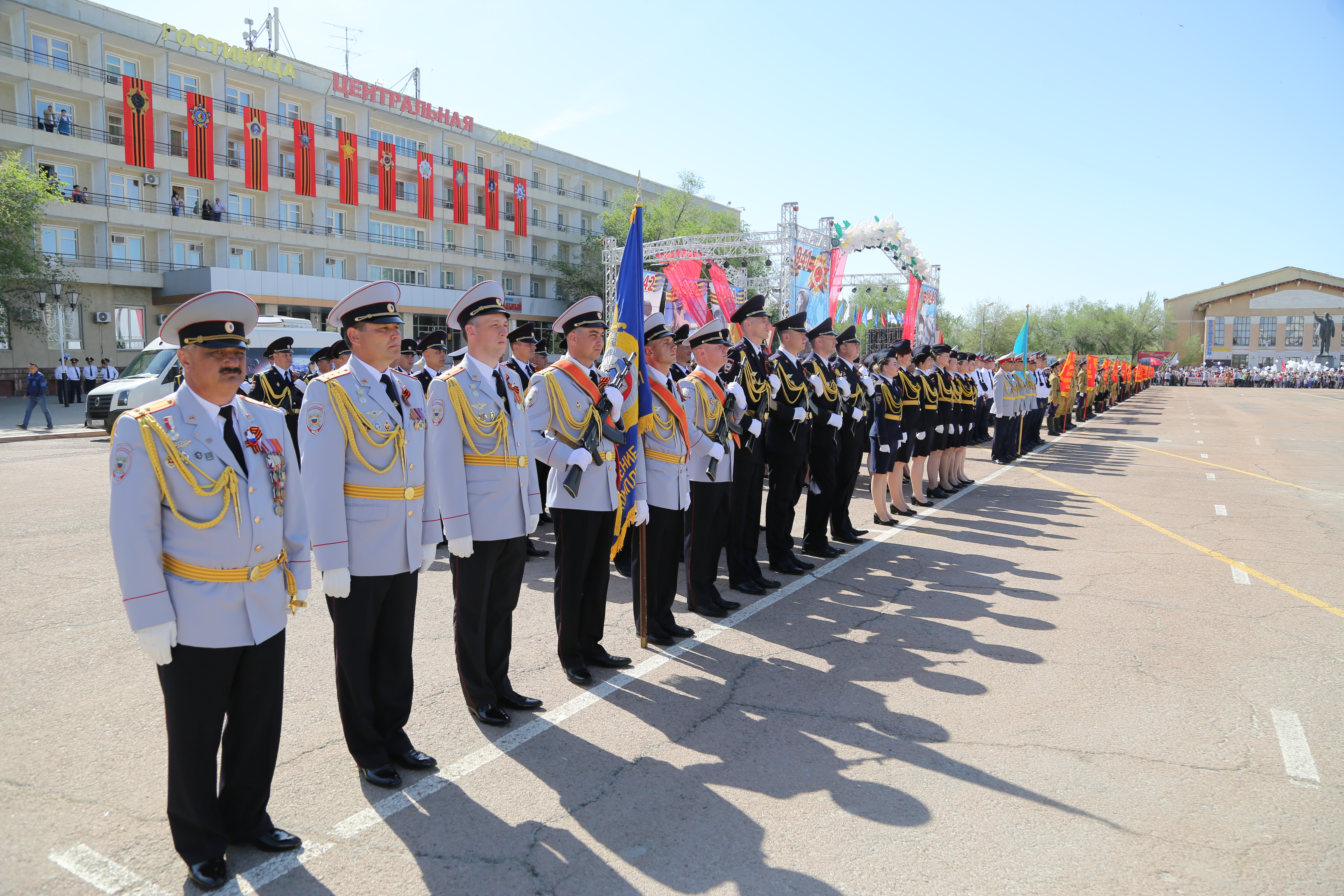 Затем началось торжественное прохождение строевых расчетов. Одна за другой колонны Спецуправления ФПС №70 МЧС России, УМВД России на комплексе "Байконур", Представительства МВД РК в городе Байконыр, а также учащиеся образовательных учреждений города, представляющие различные роды войск времен ВОВ, торжественным маршем прошли по центральной площади. С трибуны участников шествия приветствовали руководство города и космодрома Байконур, Управления по обеспечению деятельности специального представителя Президента Республики Казахстан на комплексе "Байконур", руководители правоохранительных органов, организаций и учреждений города и космодрома, представители духовенства, ветераны Великой Отечественной войны - труженики тыла.