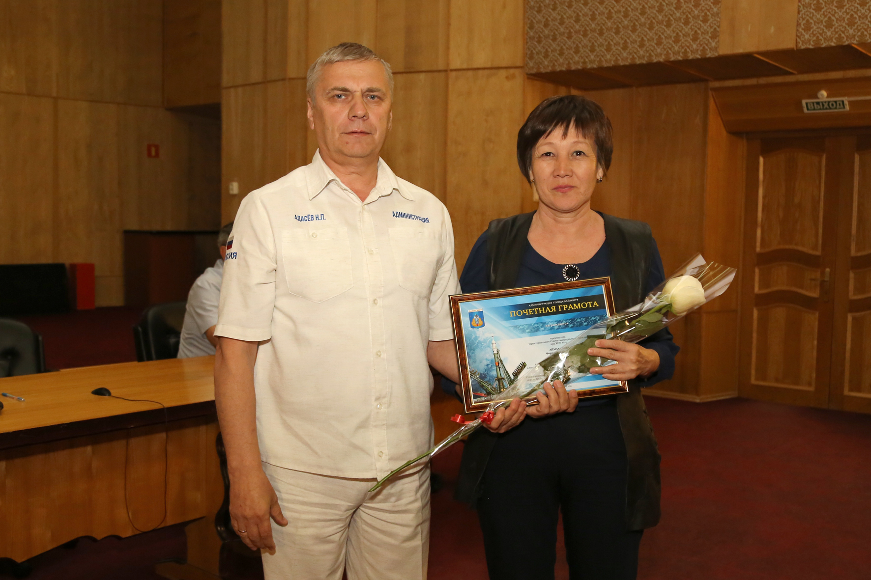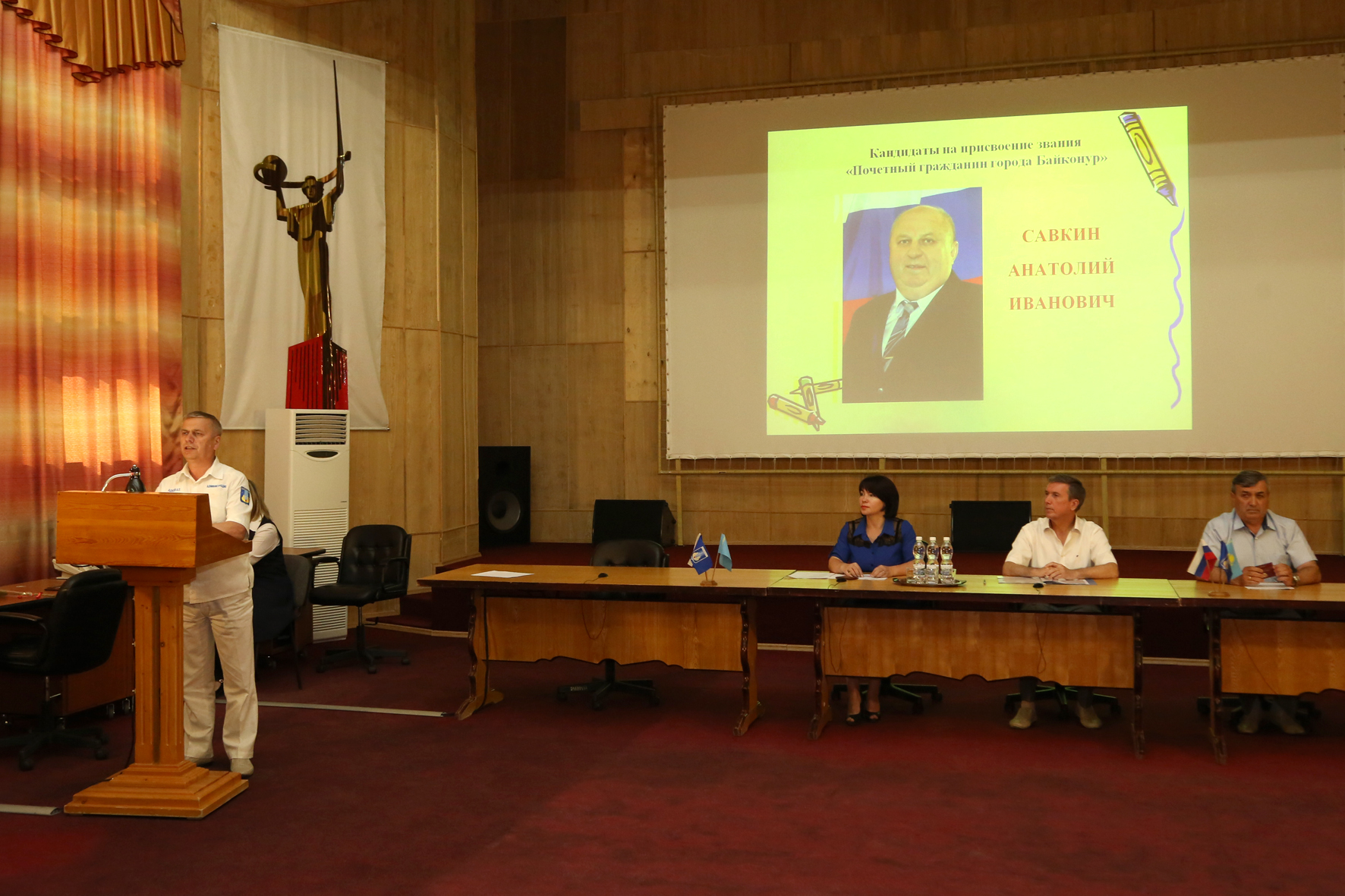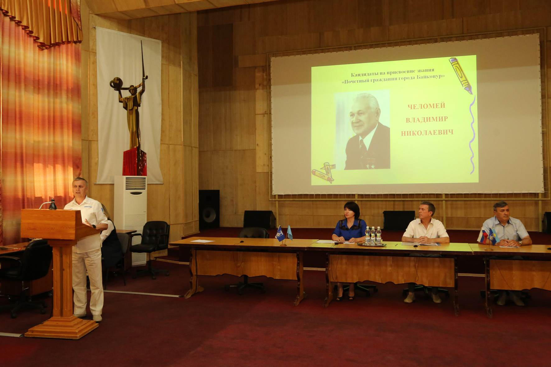 В соответствии с результатами голосования по кандидатам на присвоение звания "Почетный гражданин города Байконур", которых утвердила комиссия ономастическая по утверждению почетных званий, почетных наград, Советом решено присвоить звания "Почетный гражданин города Байконур" выдающемуся ученому, генеральному конструктору авиационной, ракетной и ракетно-космической техники Владимиру Николаевичу Челомею (посмертно) и ветерану космодрома, начальнику комплекса эксплуатации сетей связи и телекоммуникаций на космодроме Байконур филиала ЦЭНКИ - КЦ "Южный" полковнику запаса Анатолию Ивановичу Савкину, направить наградные материалы в адрес главы администрации города для издания постановления "О присвоении звания "Почетный гражданин города Байконур".