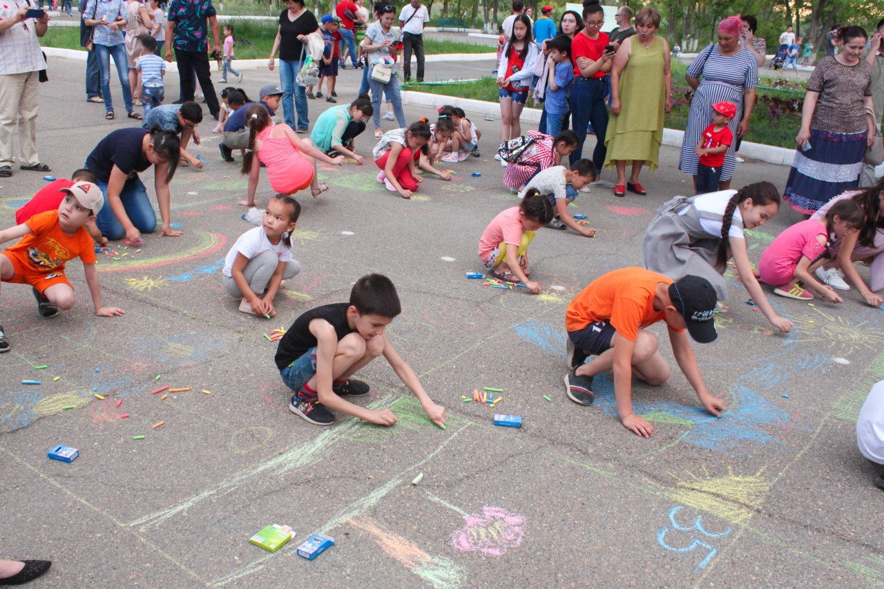 Участники театрального коллектива "Мельпомена" развлекали гостей праздника веселыми забавами. Дети соревновались в перетягивании каната, в подвижныx играx, в творческих состязаниях. Для выполнения условий конкурса каждый ребёнок получил по набору цветных мелков. За несколько минут, при помощи разноцветных мелков и детской фантазии, аллея парка превратилась в яркий ковер из причудливых цветочных рисунков. Все старания ребятишек были щедро оценены организаторами и жюри конкурса - каждый получил свой заслуженный приз.