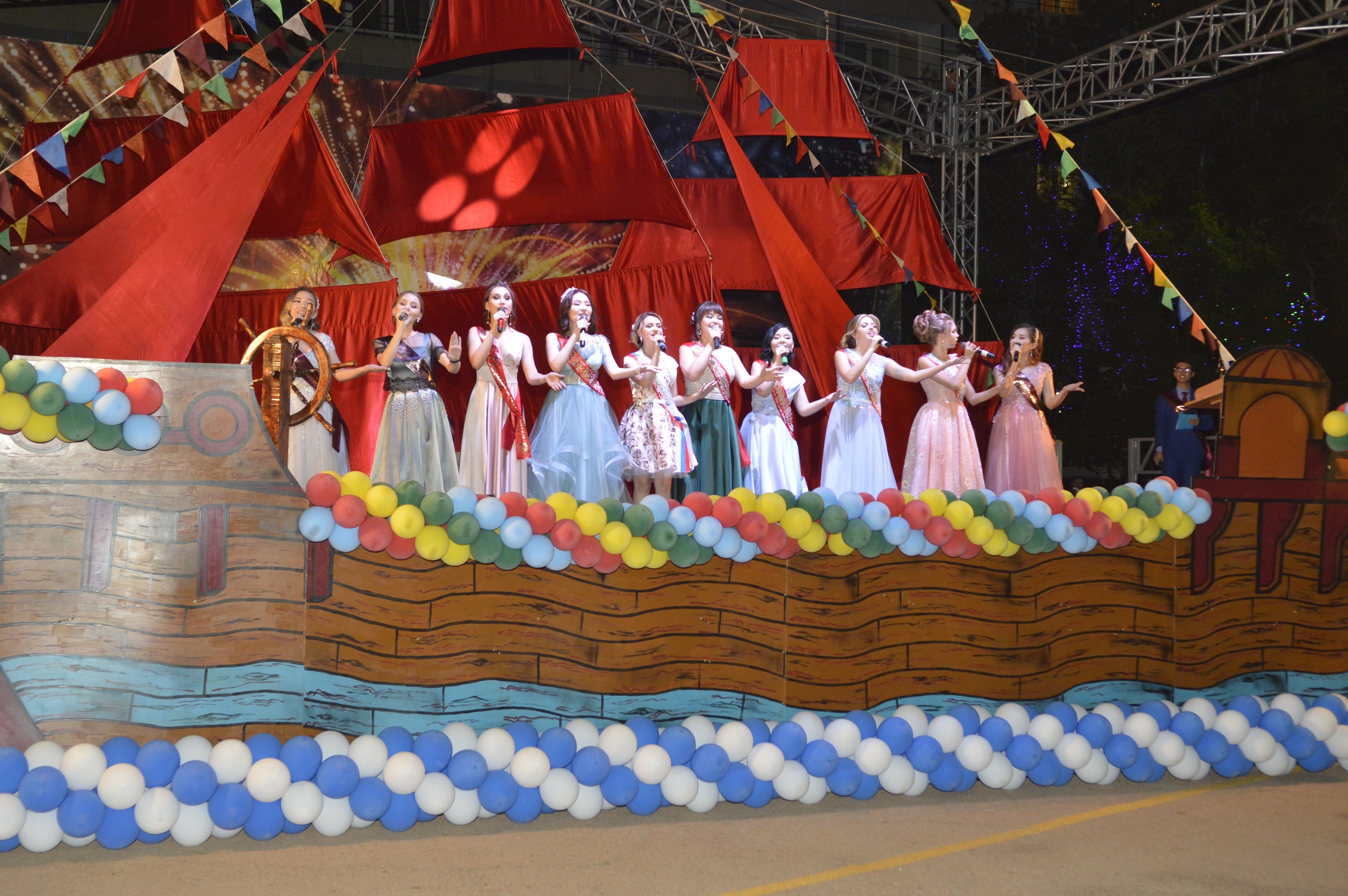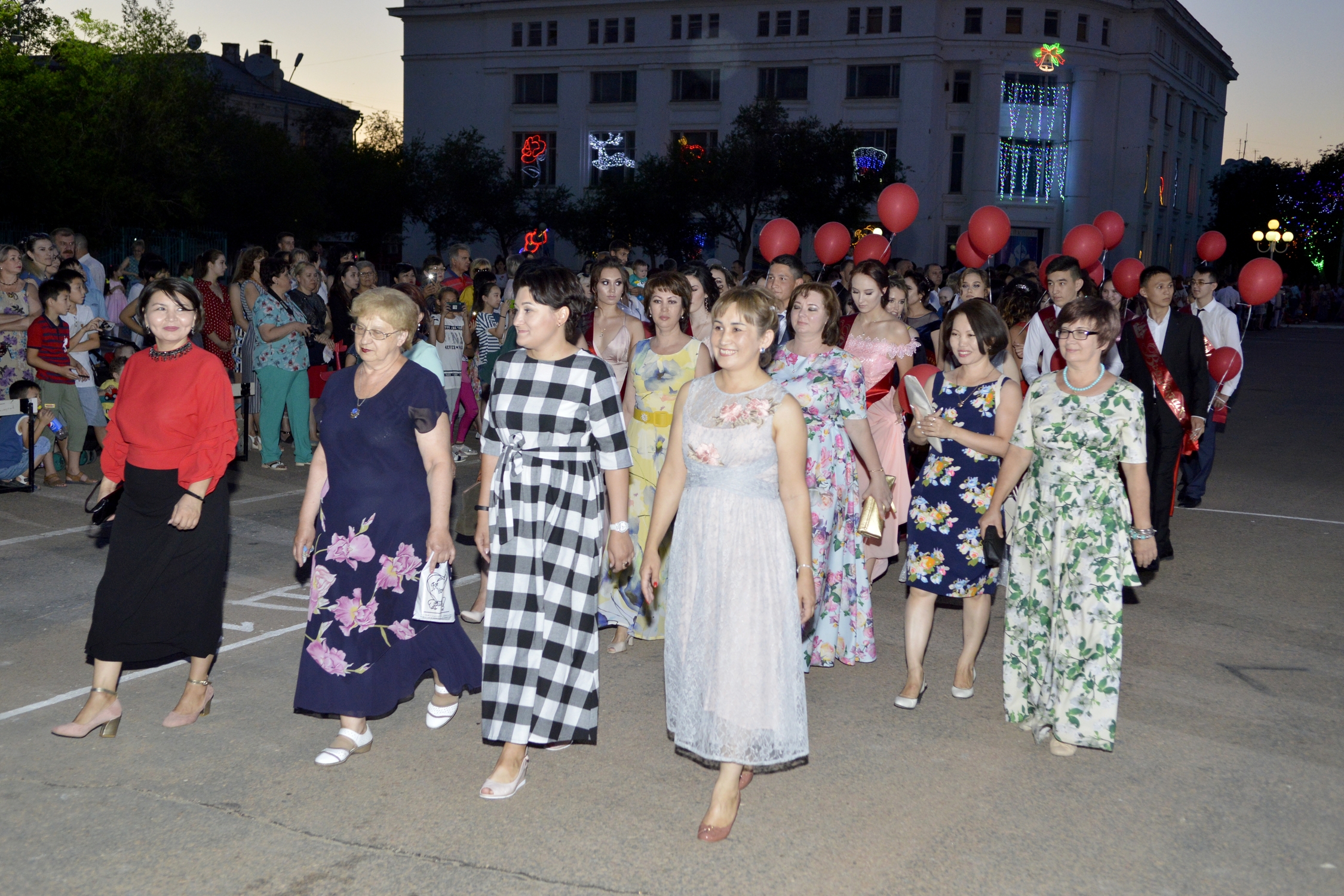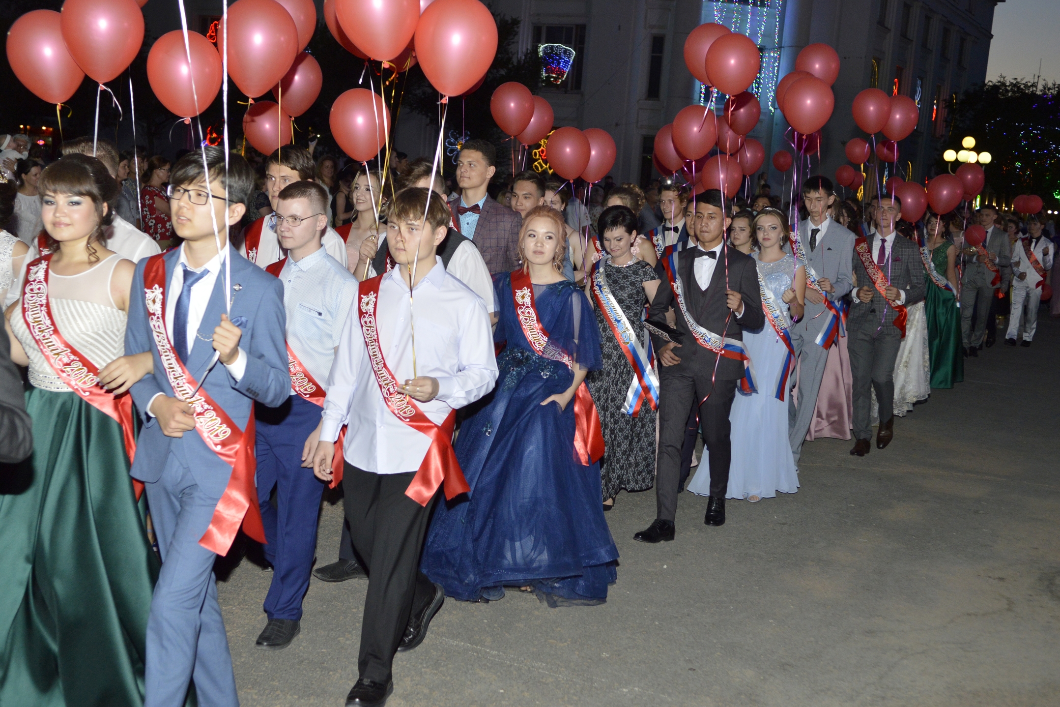 В этом году школу окончили 277 человек. Под громкие аплодисменты колонны выпускников, которые возглавляли директора школ и классные руководители, вышли на площадь. Со сцены, стилизованной под корабль с алыми парусами, ребят и педагогов приветствовали глава администрации города Байконура Константин Бусыгин, заместители главы Виктор Лопаткин и Николай Адасев, руководитель Аппарата главы Арсен Каспаров, начальник Управления образованием Георгий Глазунов и настоятель Храма св. вмч. Георгия Победоносца протоирей отец Сергий.