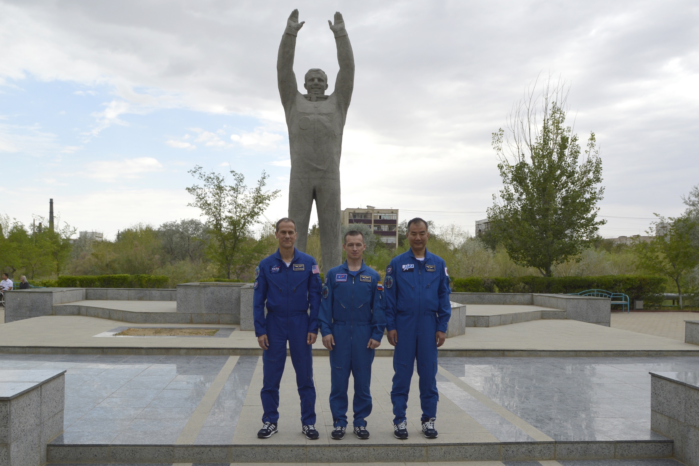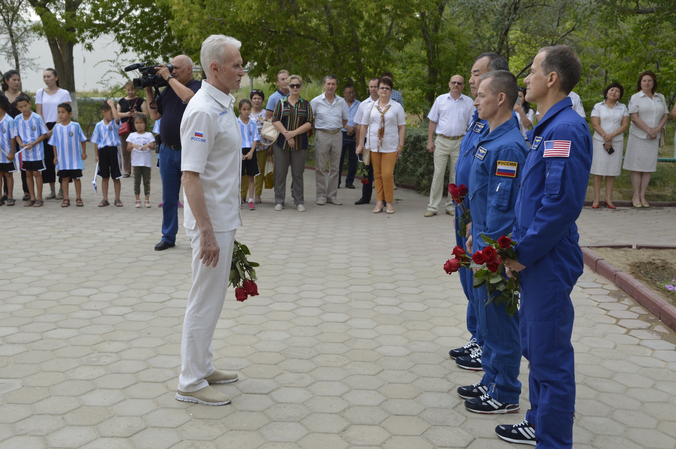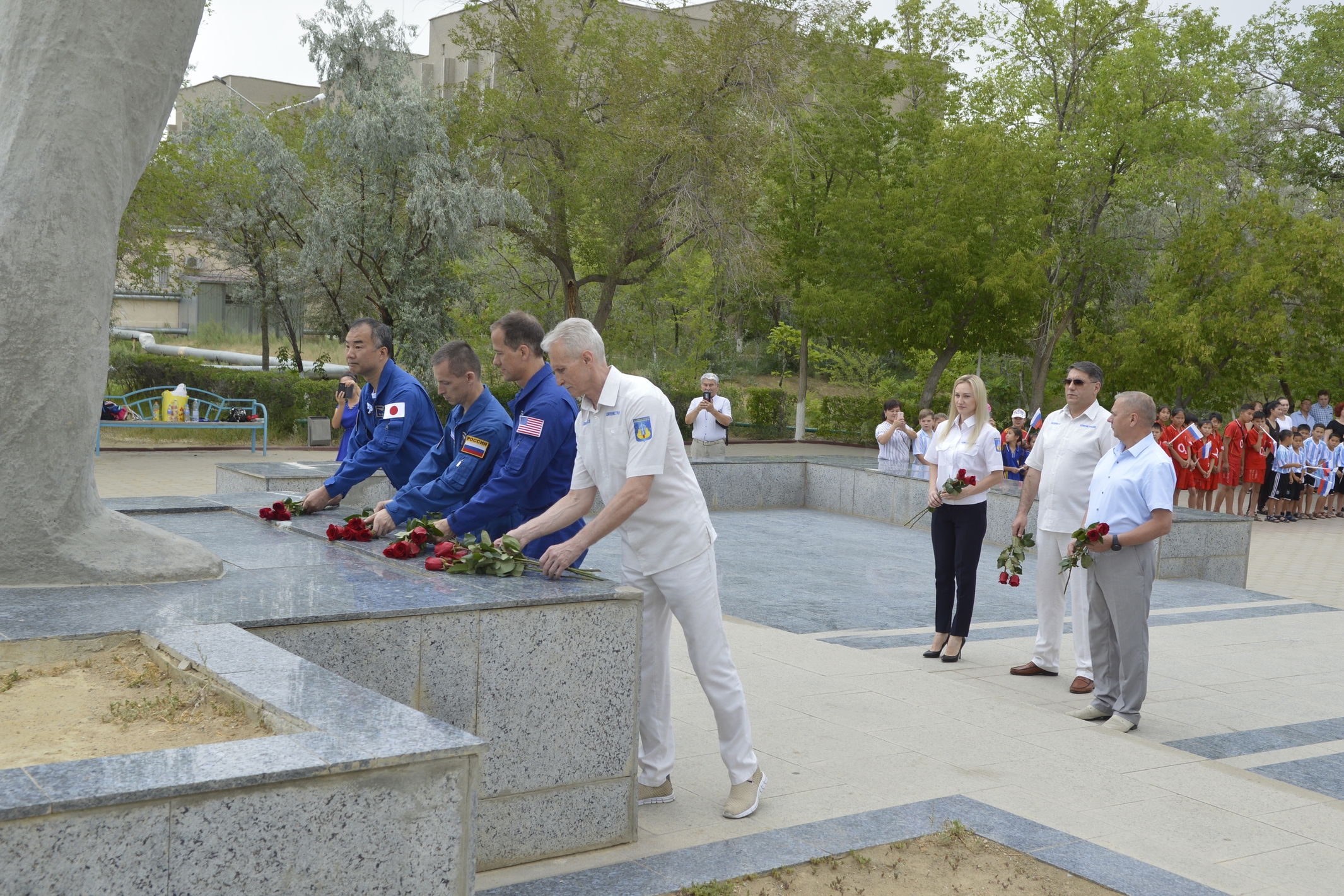Затем экипаж отдал дань памяти легендарному конструктору Сергею Королёву и побывал в городском музее истории космодрома Байконур.