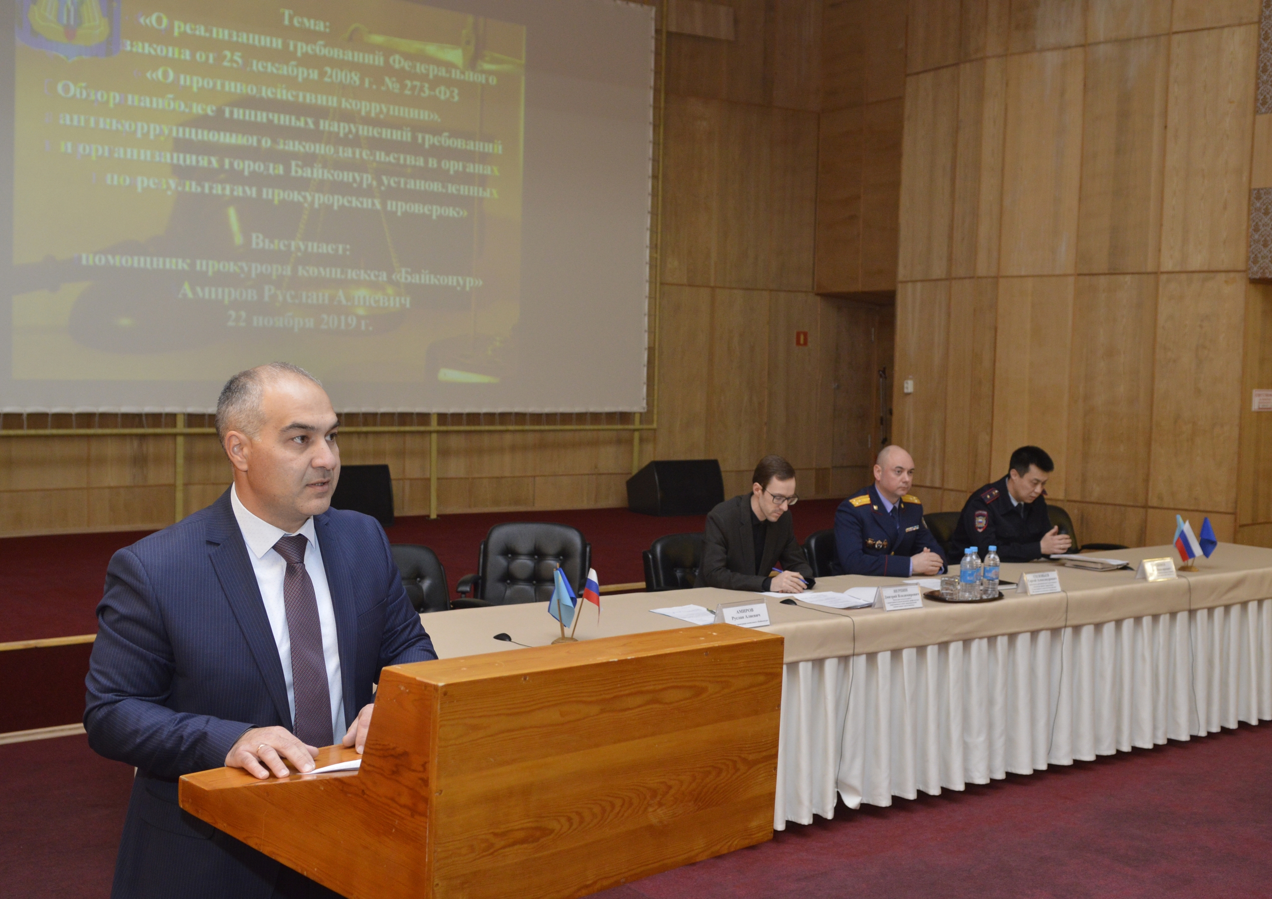 Помощник прокурора комплекса «Байконур» Руслан Амиров проинформировал о требованиях Федерального закона от 25 декабря 2008 года № 273-ФЗ «О противодействии коррупции», сообщил о результатах работы прокуратуры комплекса «Байконур» по противодействию коррупции в текущем году и привел обзор наиболее типичных нарушений требований антикоррупционного законодательства, выявленных прокуратурой комплекса «Байконур» в 2018 году и за истекший период 2019 года.