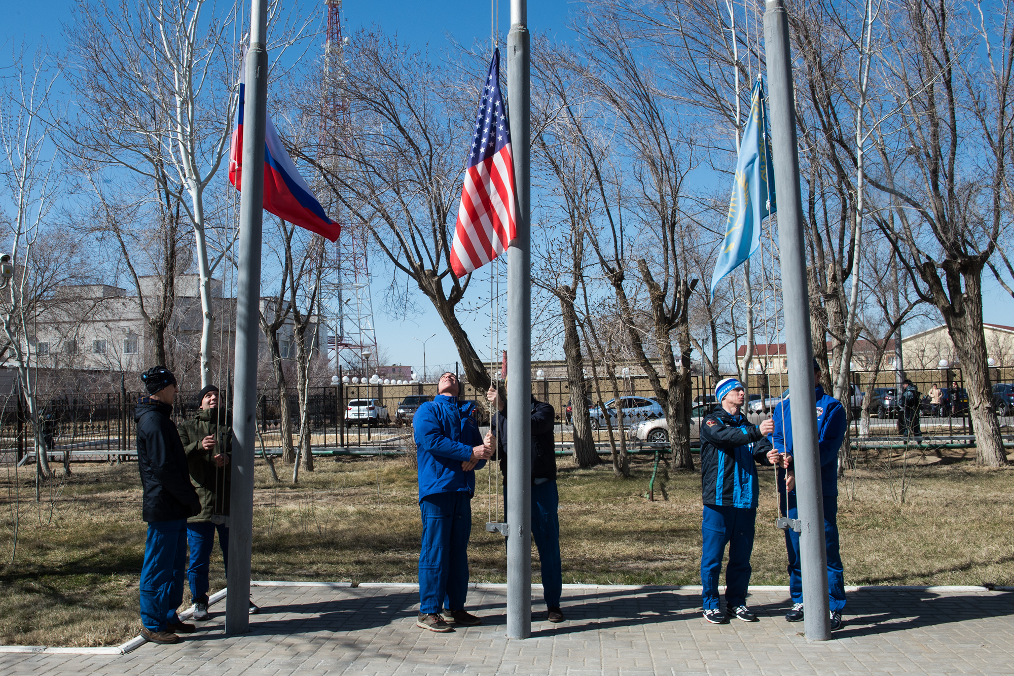 Космонавты Роскосмоса Анатолий Иванишин и Иван Вагнер подняли флаг России, астронавты НАСА Кристофер Кэссиди и Стивен Боуэн – флаг США, космонавты Роскосмоса Сергей Рыжиков и Андрей Бабкин – флаг Казахстана.