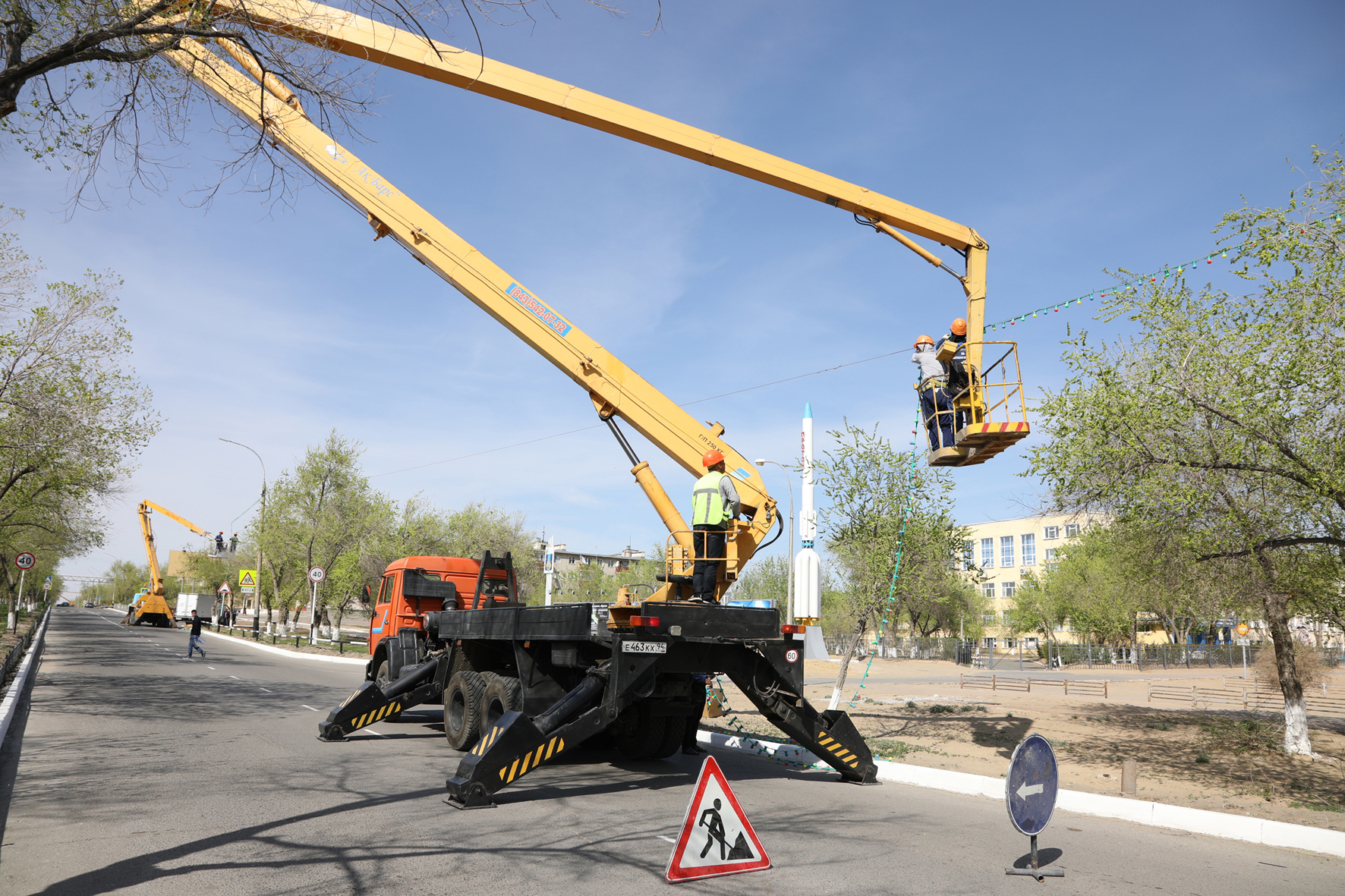 Работники предприятия «Жилищное хозяйство» размещают на проспекте Королева гирлянды белт лайт, общая протяженность которых составляет более 4,5 км.
