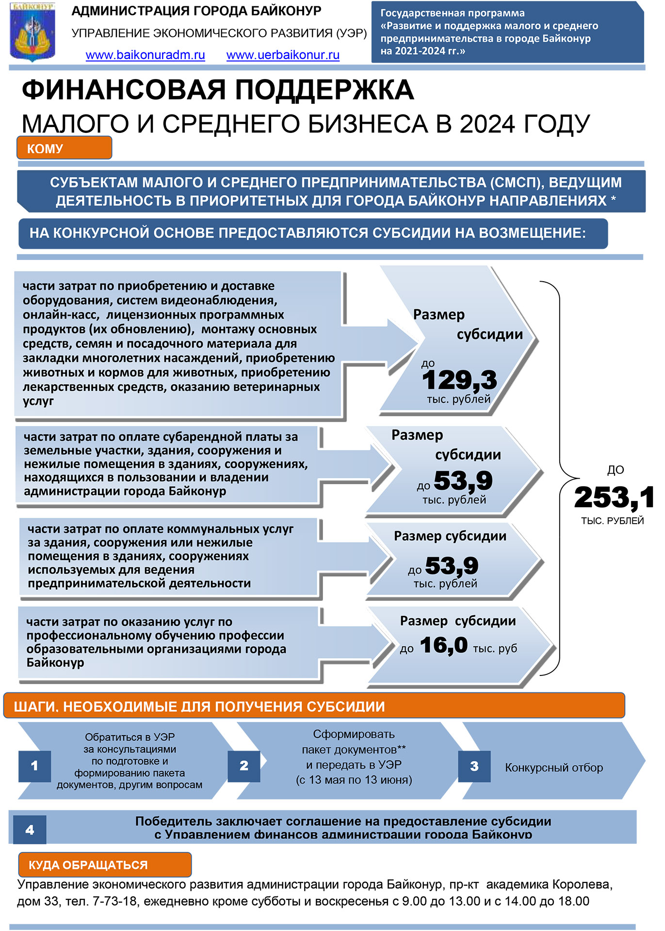 Адрес приема документов: 468320, г. Байконур, проспект академика Королева, дом 33, Управление экономического развития администрации города Байконур, кабинет 431. Контактные телефоны: 8 (33622) 7-73-18.