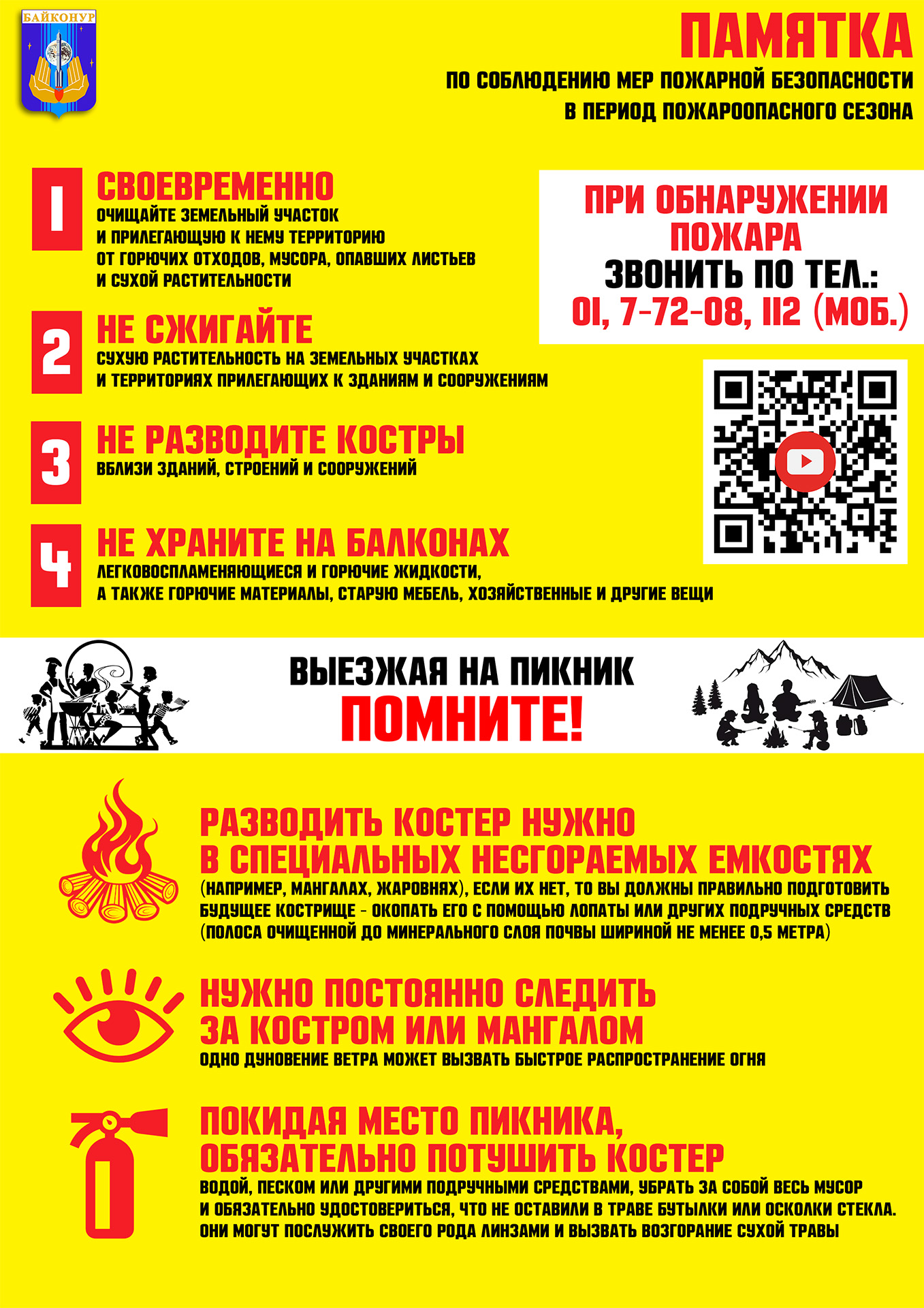 Уважаемые байконурцы! С наступлением летнего пожароопасного периода администрация города Байконура напоминает жителям и гостям города о необходимости соблюдения мер пожарной безопасности, а особенно при обращении с огнём! Пожар – не стихия, а следствие беспечности людей!