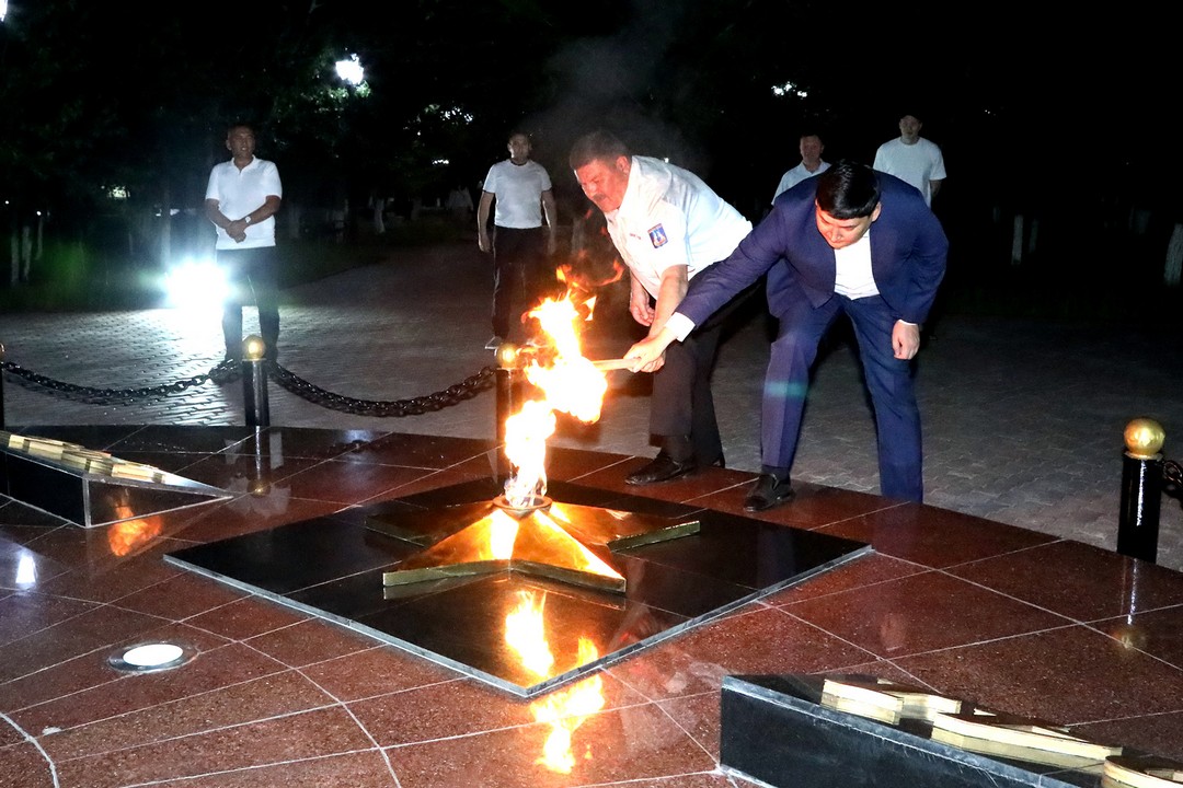 Вечером 10 июня Константин Бусыгин и Кайрат Нуртай одним факелом зажгли вечный огонь у подножия памятника 75-летию Победы в Великой Отечественной войне.