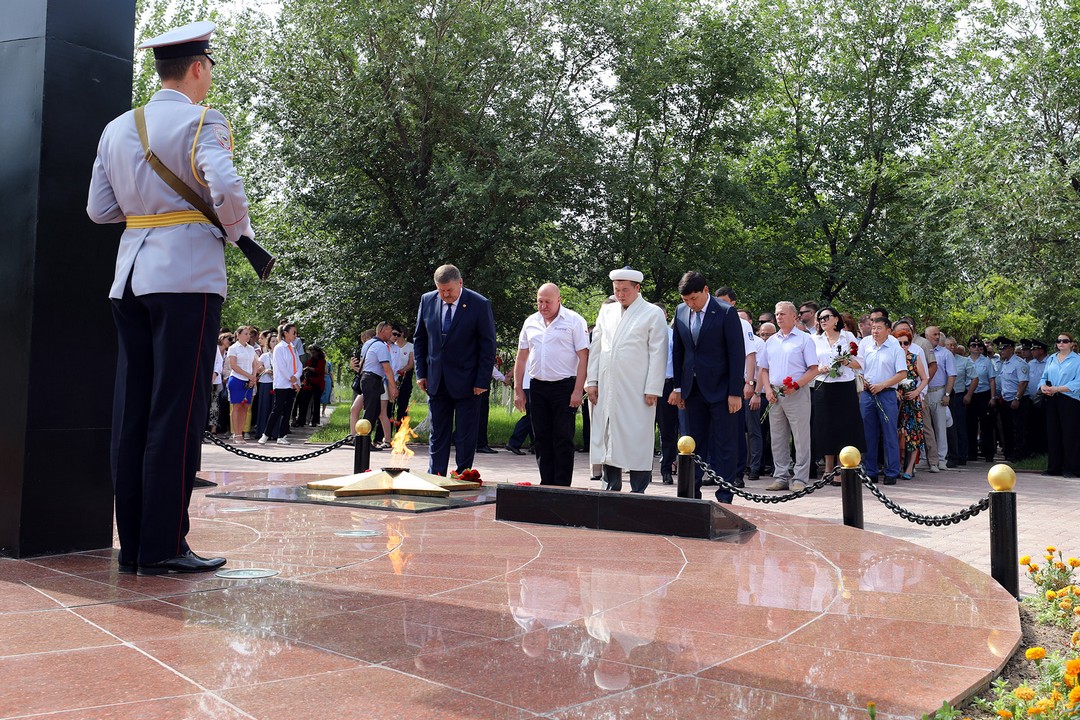 Настоятель храма святого великомученика Георгия Победоносца иерей Даниил провёл панихиду по 27 миллионам погибших в годы Великой Отечественной войны, главный имам мечети «Жаримбет Ата» города Умиржан Тобжанов прочитал Коран.