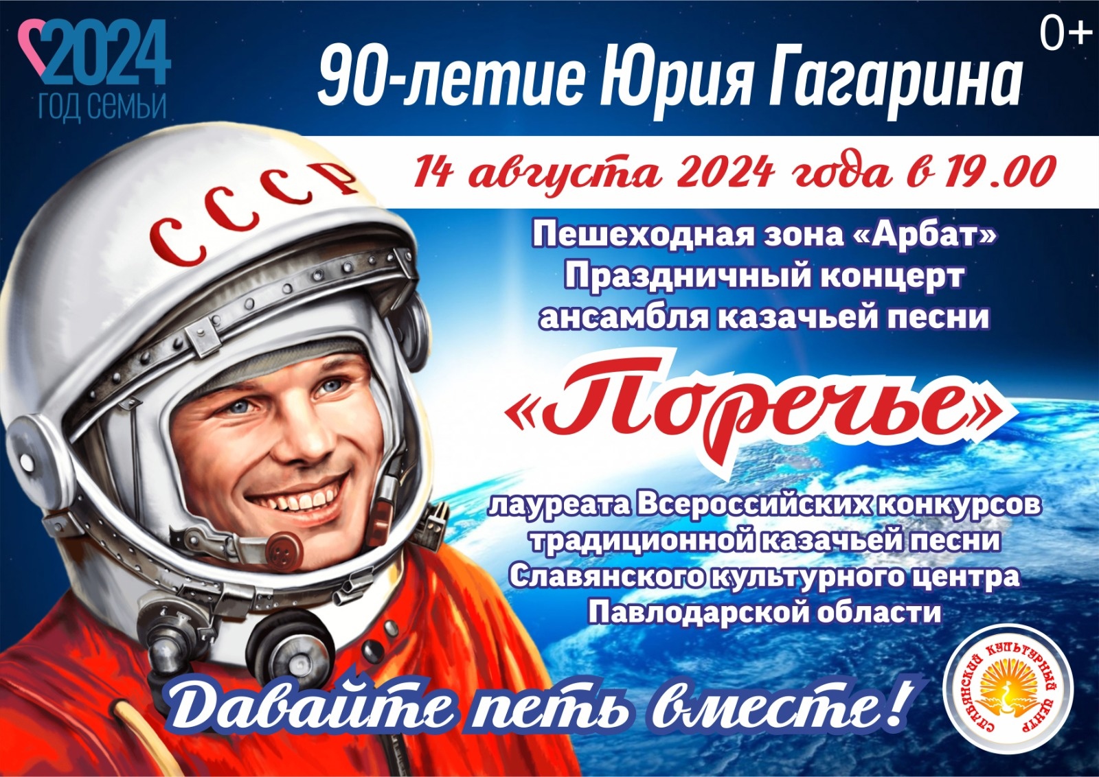 14 августа на пешеходной зоне «Арбат» состоится праздничный концерт ансамбля казачьей песни «Поречье», посвящённый 90-летию Юрия Гагарина. Начало в 19:00. Приглашаем жителей и гостей города принять участие.