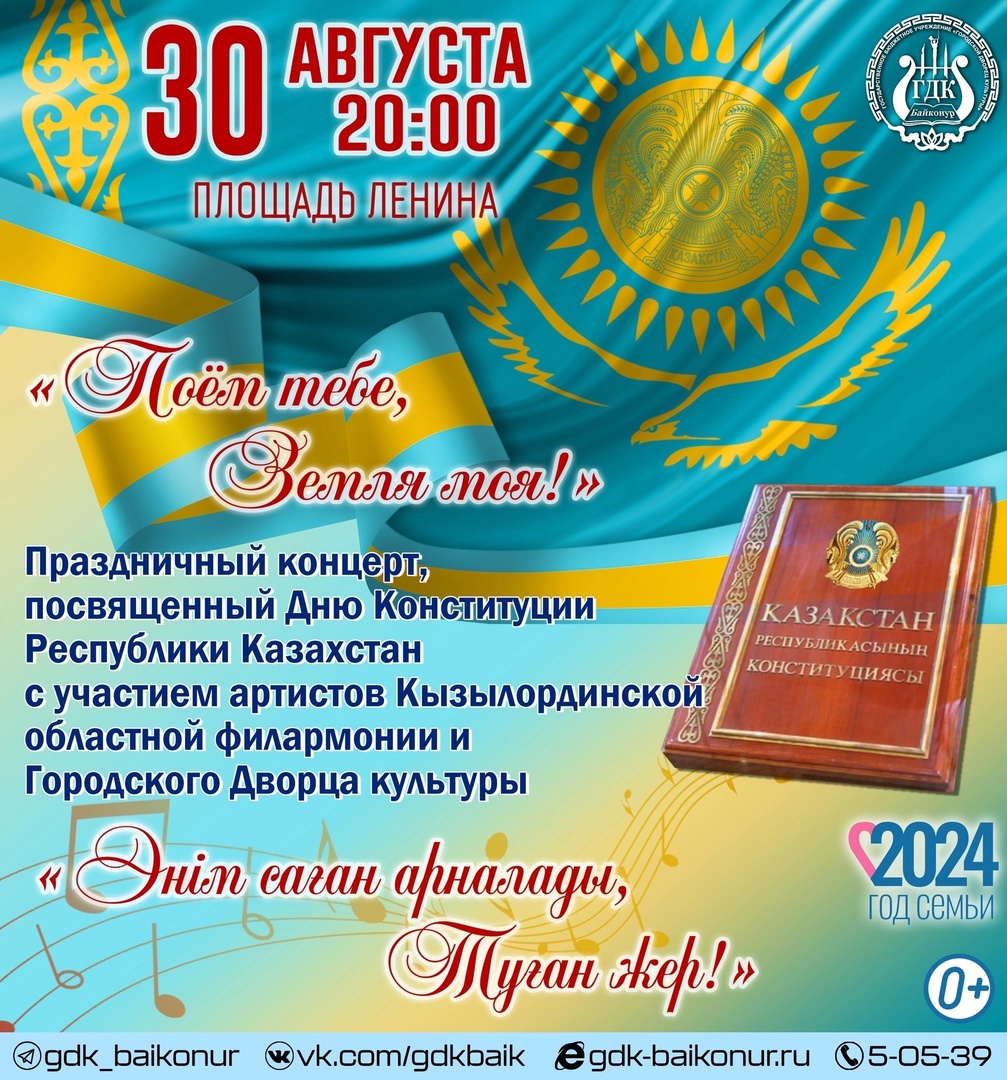 30 августа на площади Ленина состоится праздничная концертная программа, посвящённая Дню Конституции Республики Казахстан и Дню знаний. Начало в 20:00. Приглашаем жителей и гостей города принять участие.