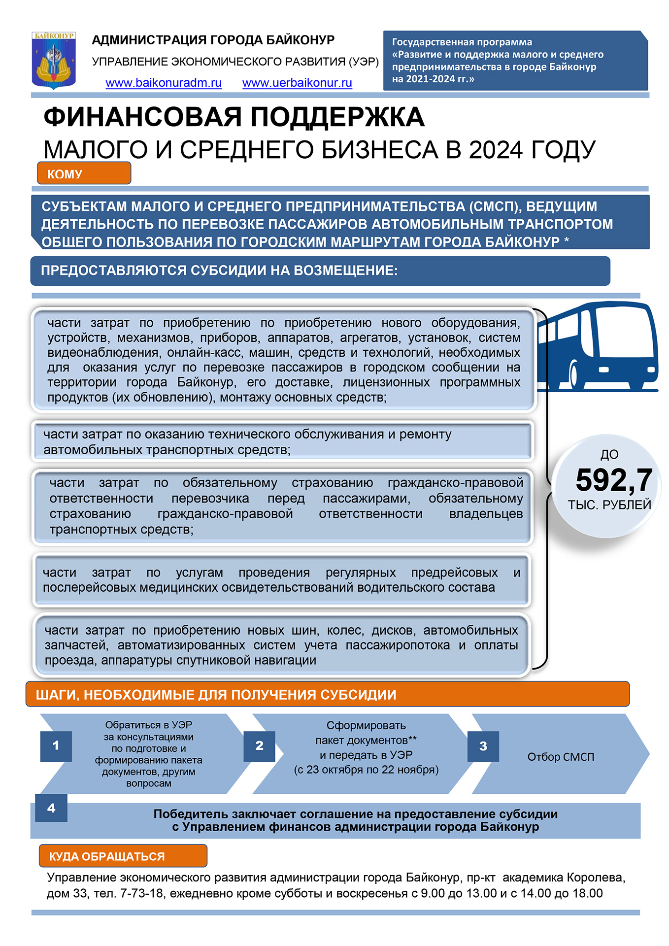 Дата окончания приёма заявлений и документов от субъектов малого и среднего предпринимательства – 22 ноября 2024 года (включительно). Адрес приёма документов: 468320, г. Байконур, проспект Королёва, дом 33, Управление экономического развития администрации города Байконур, кабинет 432. Контактные телефоны: 8 (33622) 7-73-18.