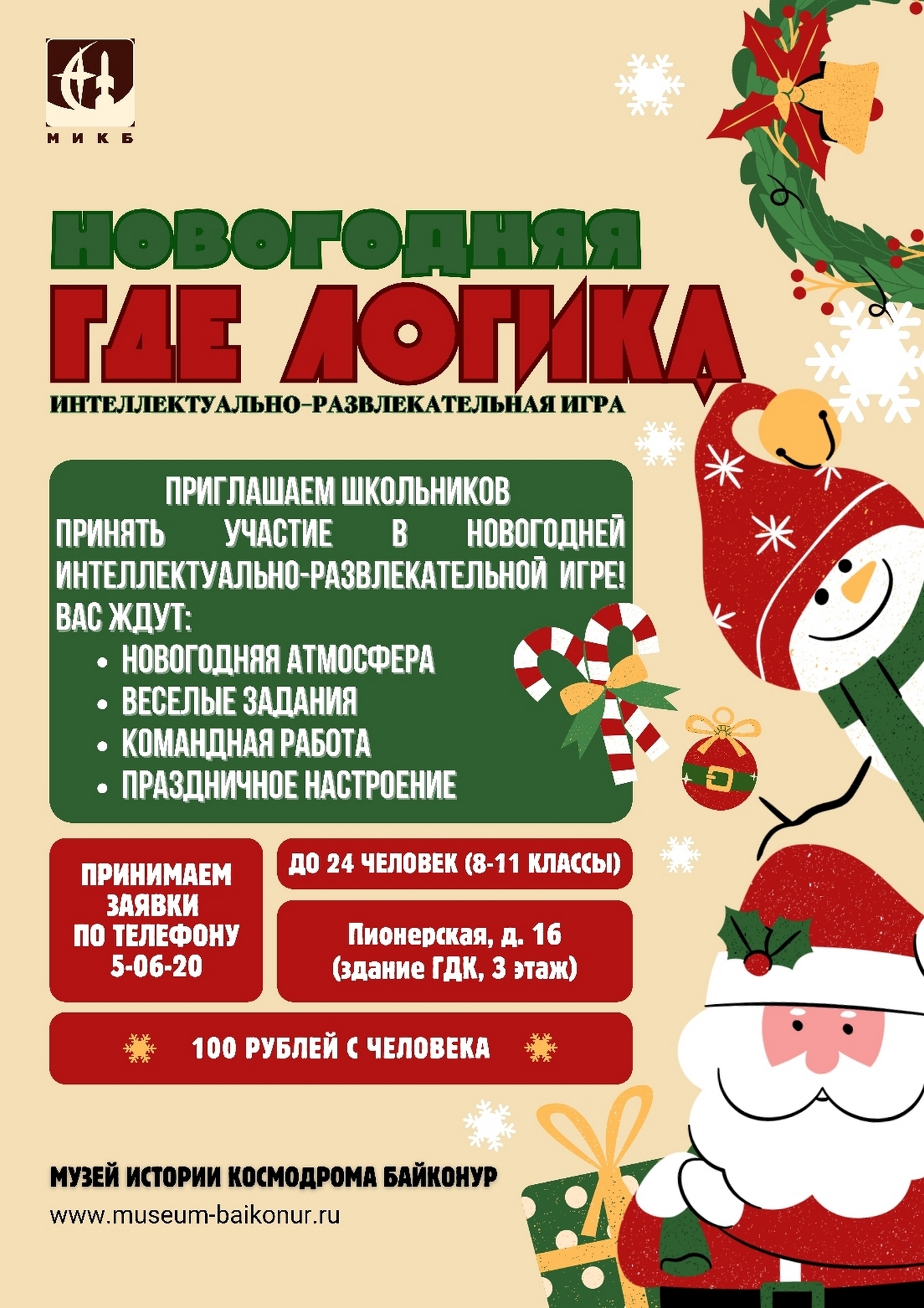 Музей истории космодрома Байконур приглашает к участию в увлекательной новогодней игре «Где логика?». Участники смогут проверить свою логику, сообразительность и командный дух в праздничной атмосфере.