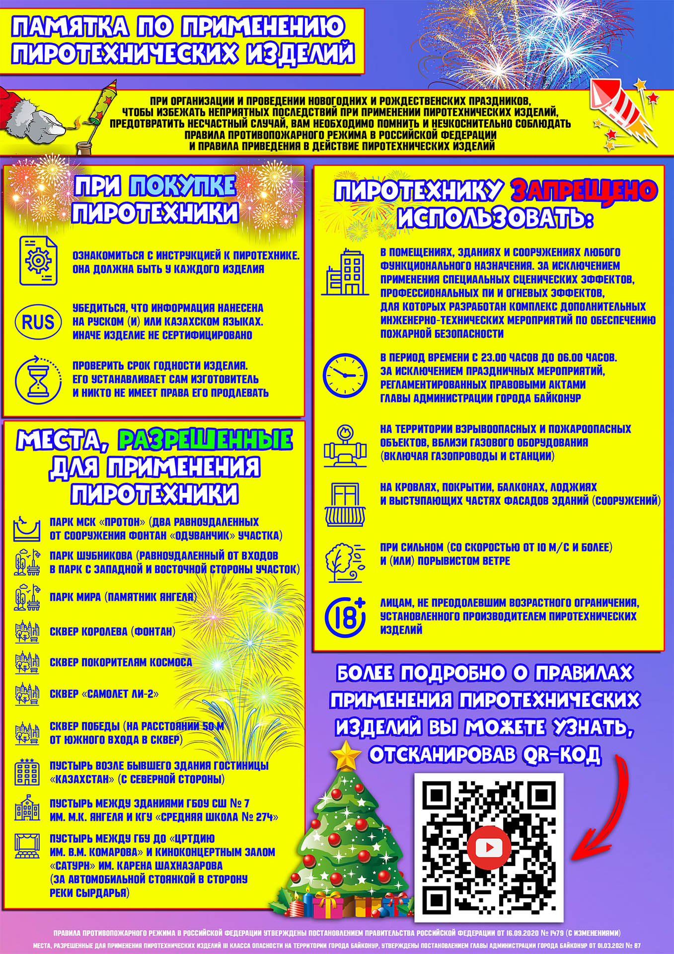Уважаемые жители и гости города Байконура! В преддверии и в период празднования нового 2025 года и Рождества Христова администрация города Байконура напоминает о правилах использования пиротехнических изделий.