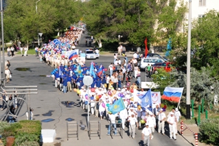 На стадионе «Десятилетие» праздник начался с торжественного прохождения более, чем 20 колонн, представивших, как на ленте времени, историю Байконура. В колоннах, вслед за оригинально оформленными машинами, шагали представители старейших коллективов космической составляющей комплекса «Байконур», городских предприятий, организаций и учреждений. Над стадионом звучали статистические данные о достижениях предприятий и имена людей, приумноживших славу предприятий Байконура. Шествие было очень тепло принято присутствующими на стадионе высокими гостями и ветеранами. Особый интерес вызвали показательные выступления спецуправления службы пожаротушения МЧС России. Пожарные провели специализированную эстафету, наглядно продемонстрировавшую их умения и навыки.