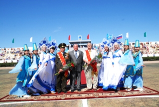 Официальная часть праздника началась с исполнения гимнов России и Казахстана, поднятия флагов двух стран, выступающих гарантом сохранения Байконура. Глава администрации Александр Мезенцев обратился к байконурцам и гостям с теплыми словами приветствий и поздравлений. Специальный представитель Президента на комплексе «Байконур» Сабит Кожаметов в своем выступлении подчеркнул нерушимость связей между Россией и Казахстаном. Перед собравшимися на стадионе прозвучало еще много добрых слов и пожеланий в адрес Байконура и байконурцев. В каждом выступлении прослеживалась мысль о многолетнем международном значении и авторитете космодрома, о вкладе каждого поколения в процветание космической гавани. Все ораторы желали Байконуру долгих лет, насыщенных работой и новыми свершениями.