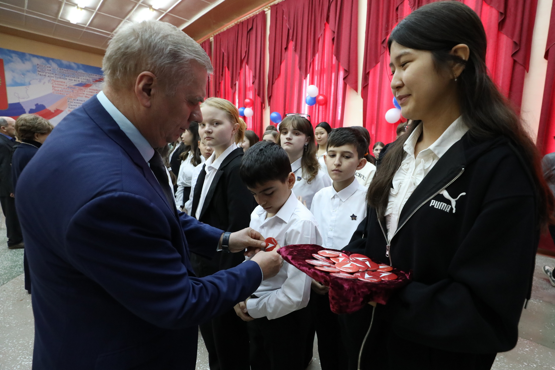 Байконурские школьники принесли торжественную клятву. После этого почётные гости мероприятия вручили нагрудные значки новым участникам «Движения Первых».