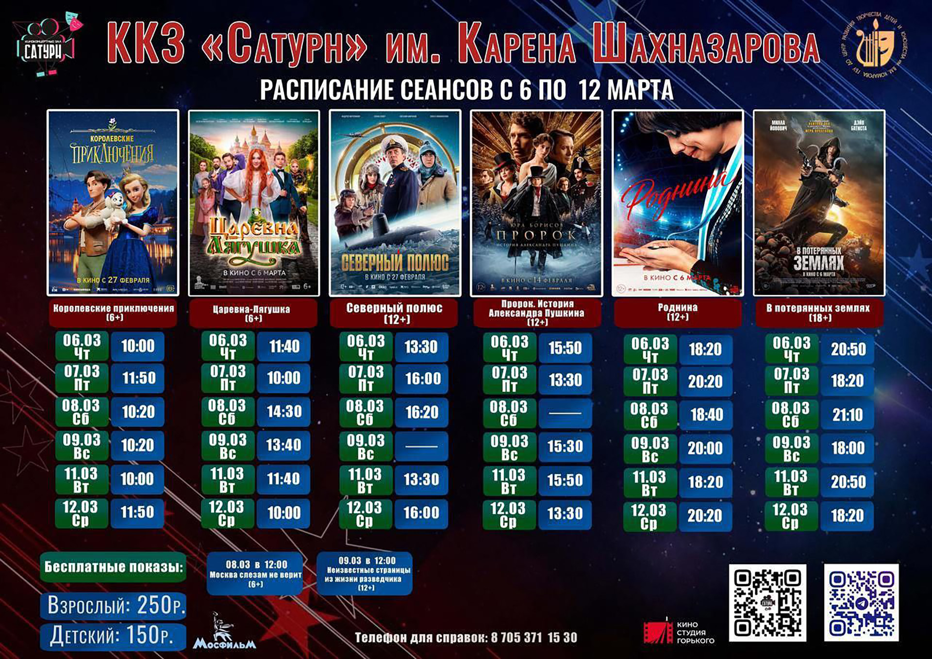 Киноконцертный зал «Сатурн» приглашает жителей и гостей города Байконура на просмотр фильмов. Расписание фильмов на следующую неделю представлено ниже.