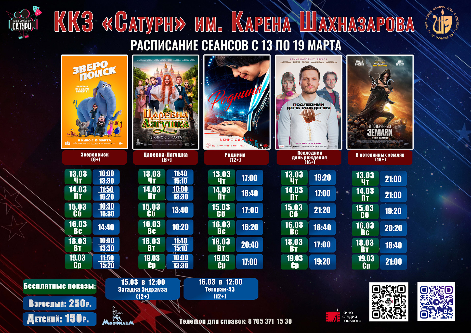 Киноконцертный зал «Сатурн» приглашает жителей и гостей города Байконура на просмотр фильмов. Расписание фильмов на следующую неделю представлено ниже.