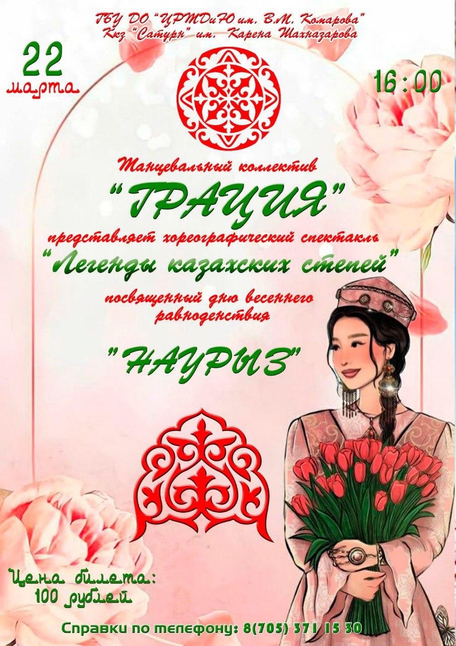 В 16:00 в киноконцертном зале «Сатурн» состоится концертная программа хореографического коллектива «Грация» «Легенда казахских степей», посвященная празднованию «Наурыз мейрамы».