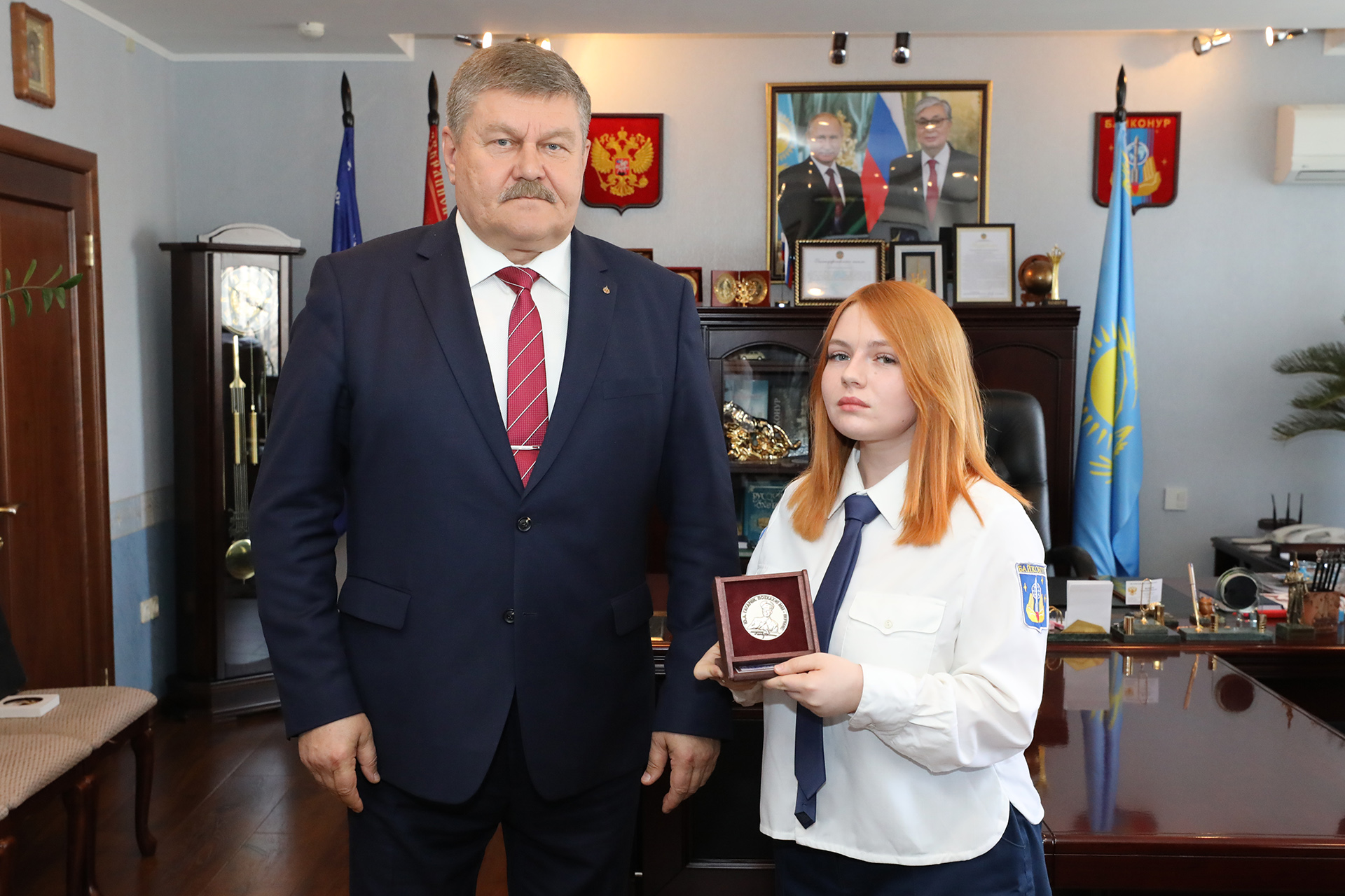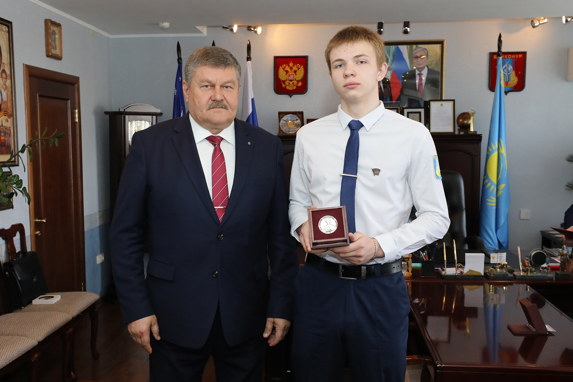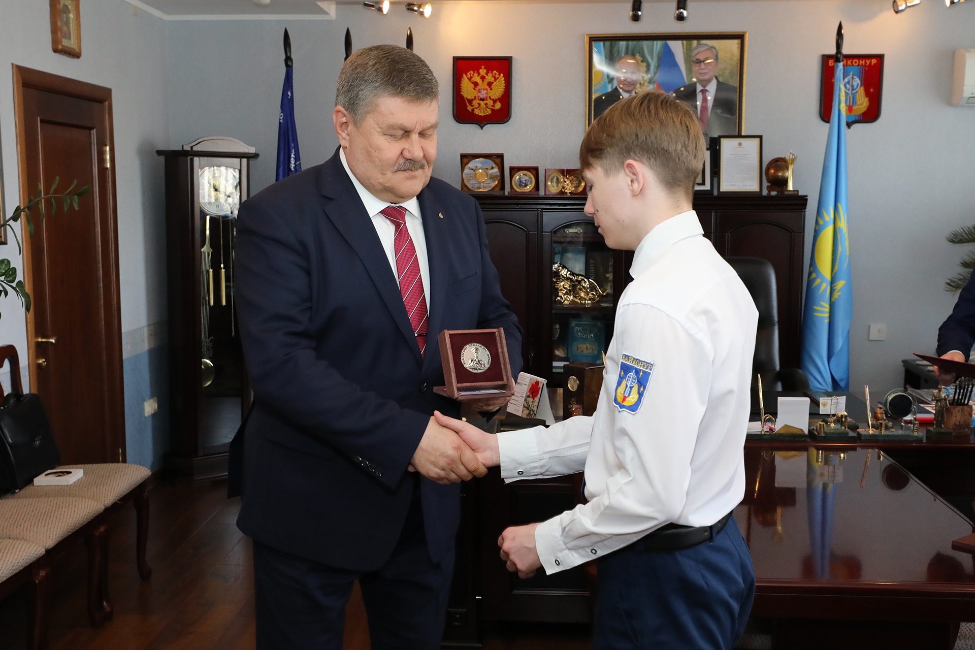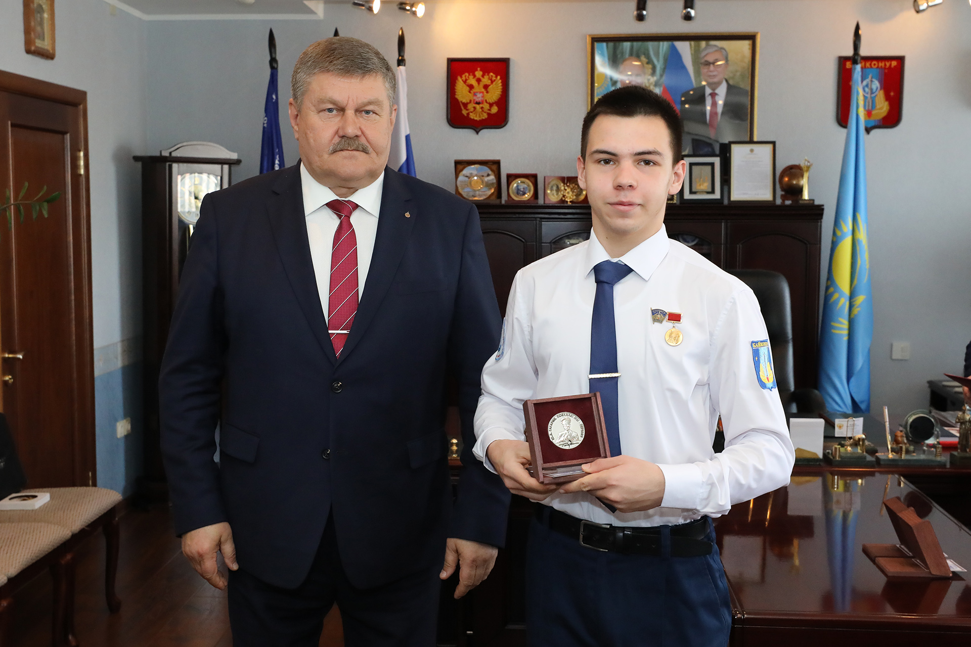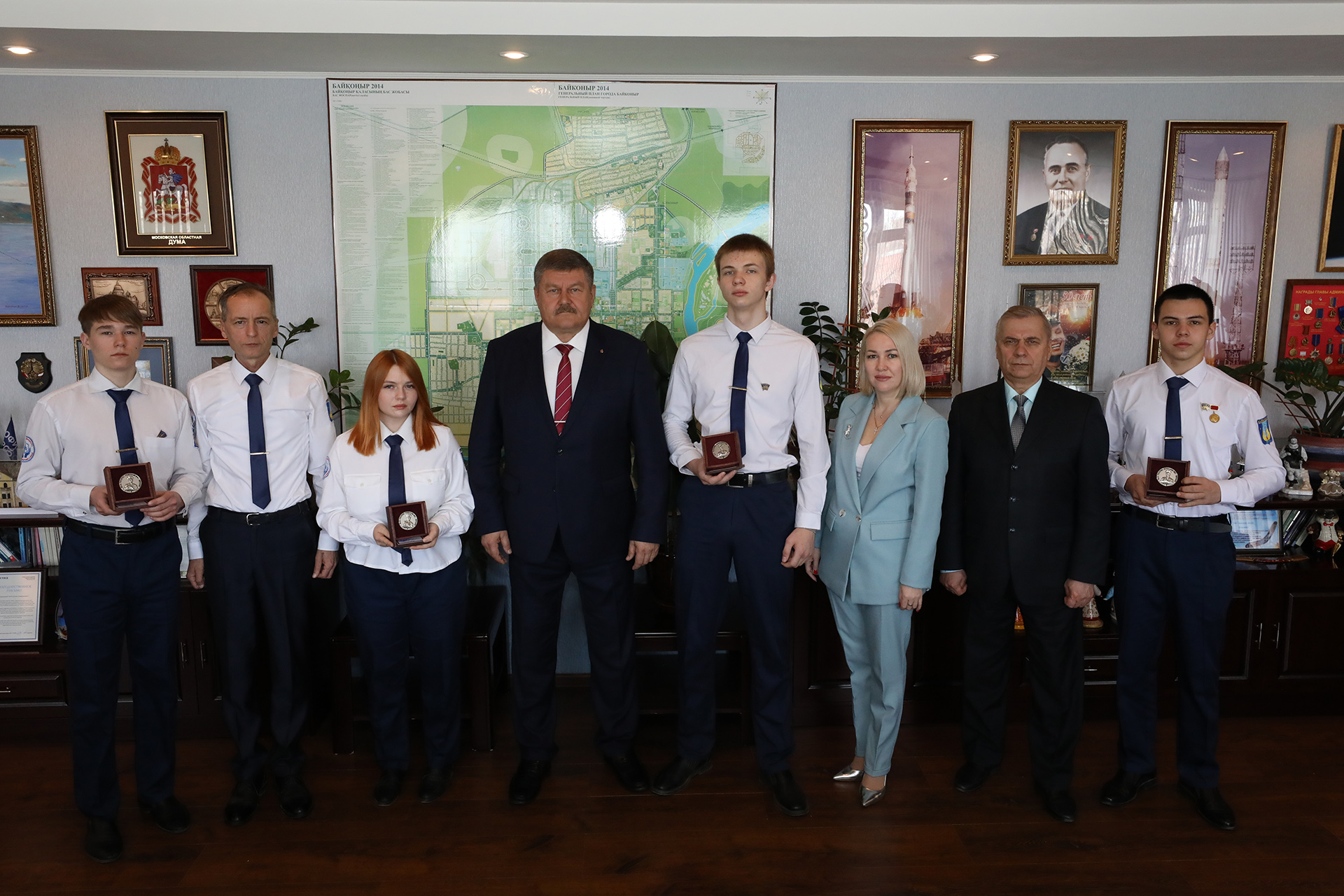 За качественную подготовку исследовательских докладов и достойное представление города Байконура на 52-х международных общественно-научных чтениях, посвященных памяти Ю.А. Гагарина, глава администрации наградил настольной медалью «Гагарин» Арсена Балагуланова, Артемия Гостева, Данилу Погорелова, Любовь Радионову.
