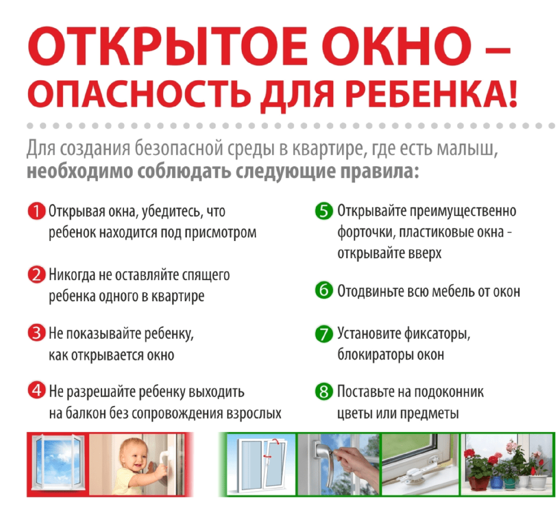 Уважаемые родители! С наступлением теплого весеннего сезона почти в каждой квартире появляется прямая угроза жизни и здоровью детей – открытые окна и балконы. Взрослые, желая проветрить помещение, открывают окна, зачастую не задумываясь о безопасности детей. Выпадение из окон и балконов жилых многоэтажных домов является одной из основных причин детского сезонного травматизма и смертности.