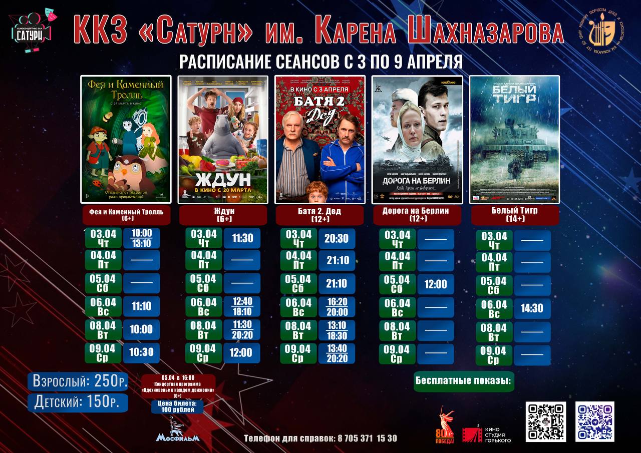03.04.2025  Киноконцертный зал «Сатурн» приглашает жителей и гостей города на просмотр фильмов