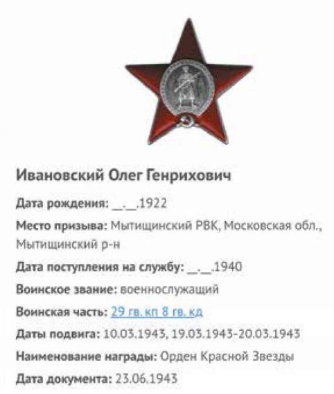 Не долечившись, он возвратился из госпиталя в строй и вновь оказался в гуще боёв – под Харьковом, в Белоруссии, Украине, Польше. Когда же в августе 1944-го наши войска остановились на Висле, его полку – теперь уже 29-му гвардейскому кавалерийскому казачьему – пришлось возвратиться на территорию СССР для участия в операции по борьбе с бандформированиями во Львовской области. Операция завершилась 30 августа, и кавалерийский корпус был переброшен на новый участок фронта – в Румынию. Затем была Венгрия, потом Чехословакия, где 14 мая 1945 г. корпус и закончил свою войну. В тот же день от полка были отобраны двенадцать лучших кавалеристов для участия в Параде Победы на Красной площади 24 июня 1945 г. В их число попал и кавалер орденов Отечественной войны I и II степени и Красной Звезды старший лейтенант Ивановский. На легендарном параде Олег Генрихович был в строю кавалерийских частей 2-го Украинского фронта.