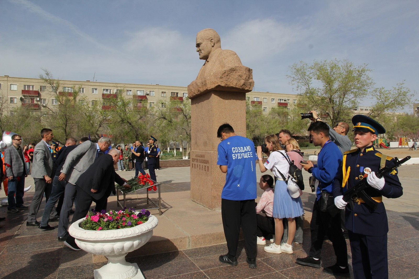 Затем небольшой митинг, сопровождаемый литературно-художественной композицией, состоялся у памятника академику Сергею Павловичу Королёву, благодаря организующей роли и конструкторскому таланту которого стал возможен первый полёт человека в космос. К памятнику Сергею Королёву также были возложены цветы в знак признательности его выдающегося вклада в развитие космонавтики.